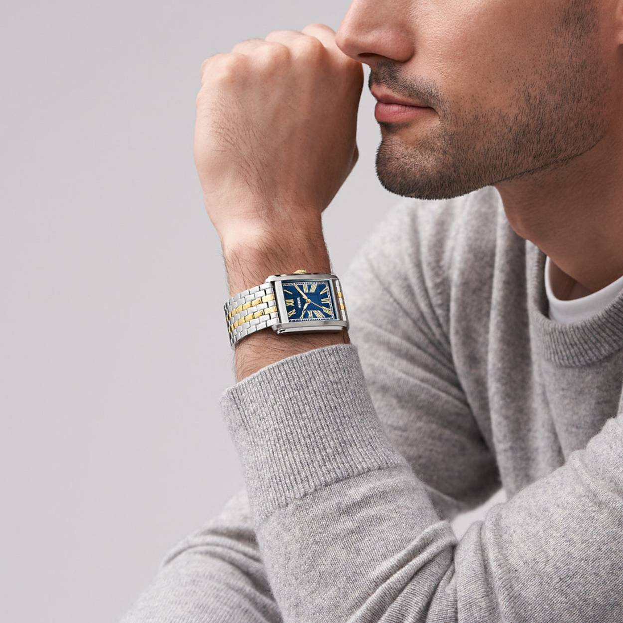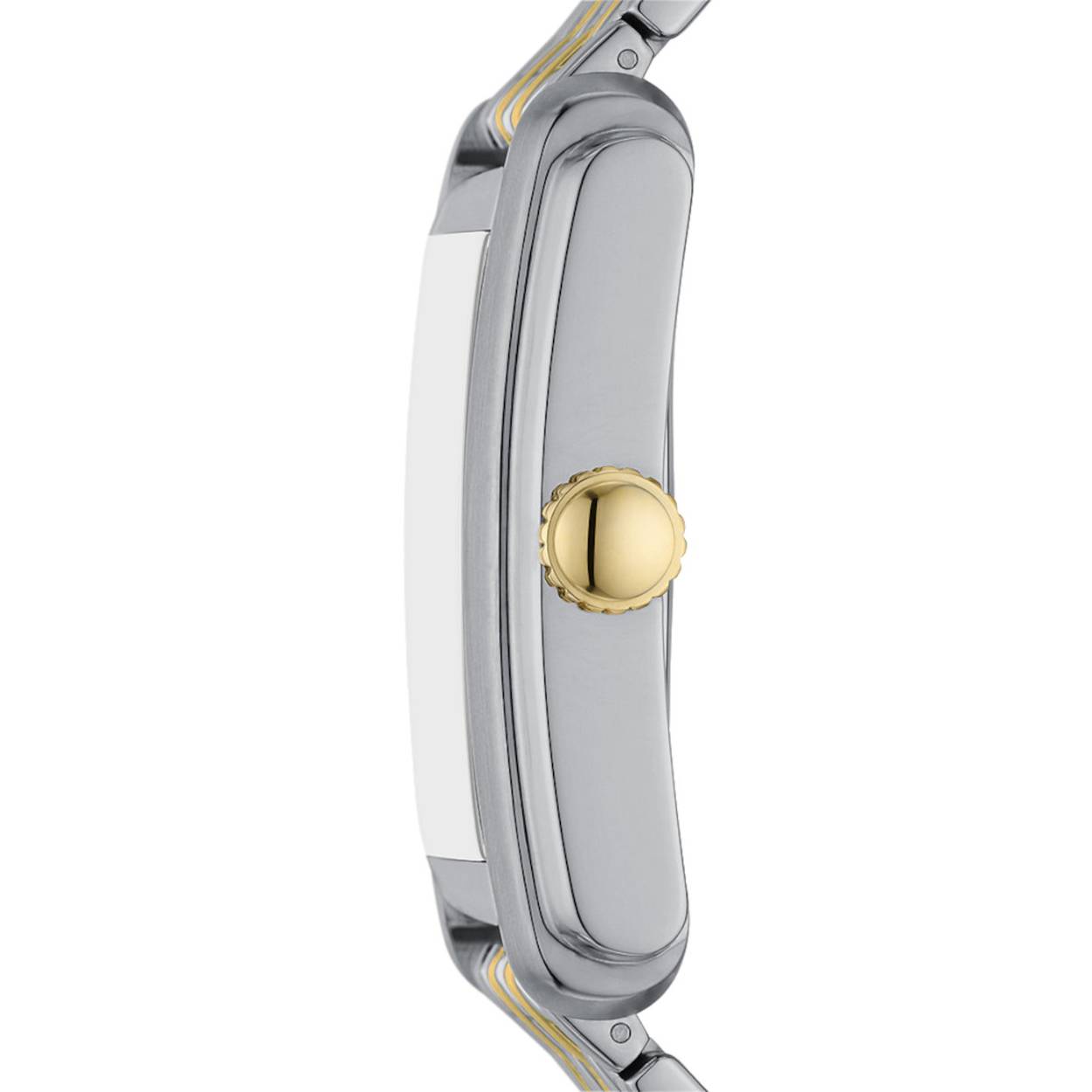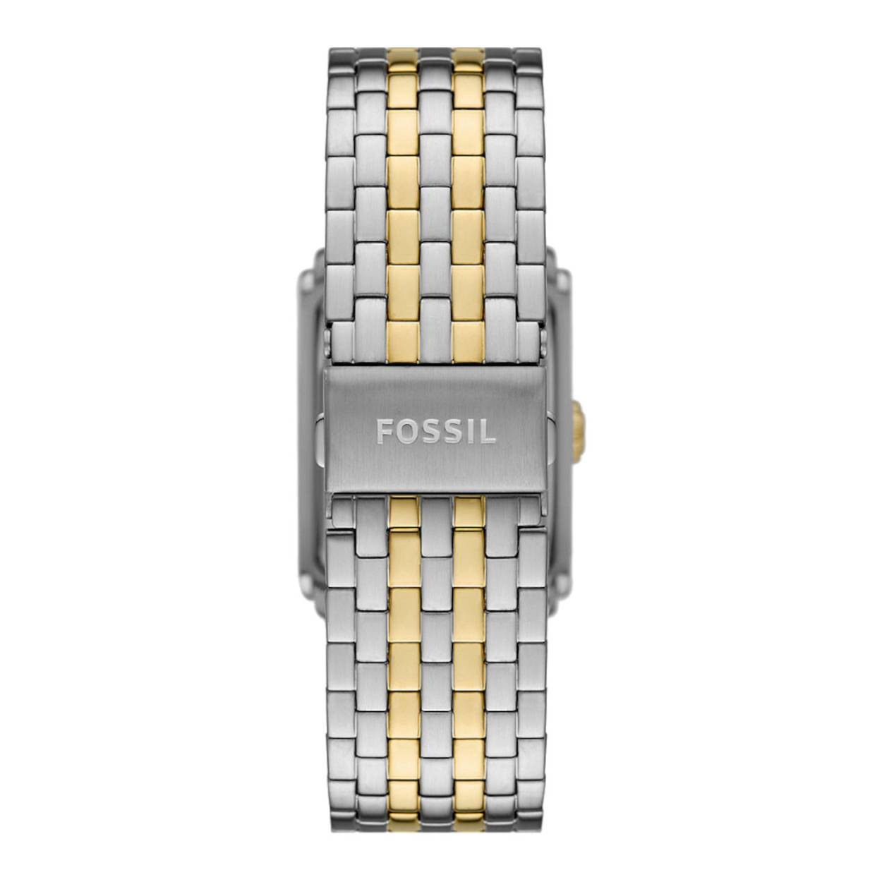 Dit Fossil horloge, uit de Carraway collectie, heeft een stalen kast en bicolor stalen band. De wijzerplaat is blauw met goudkleurige indexen en wijzers.