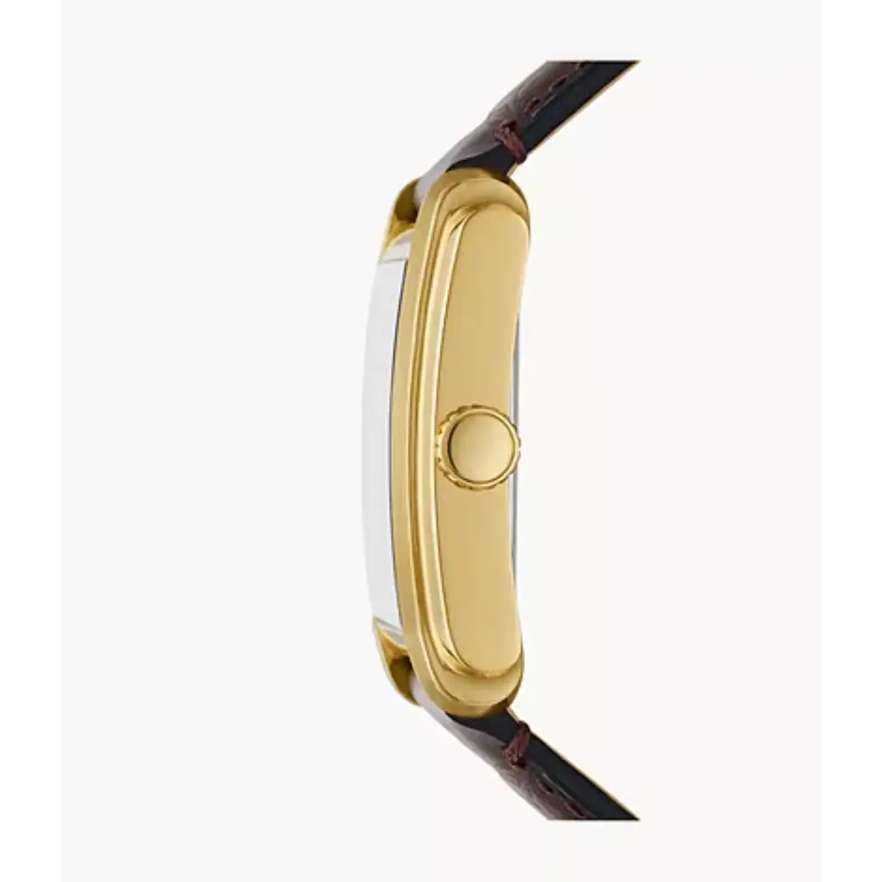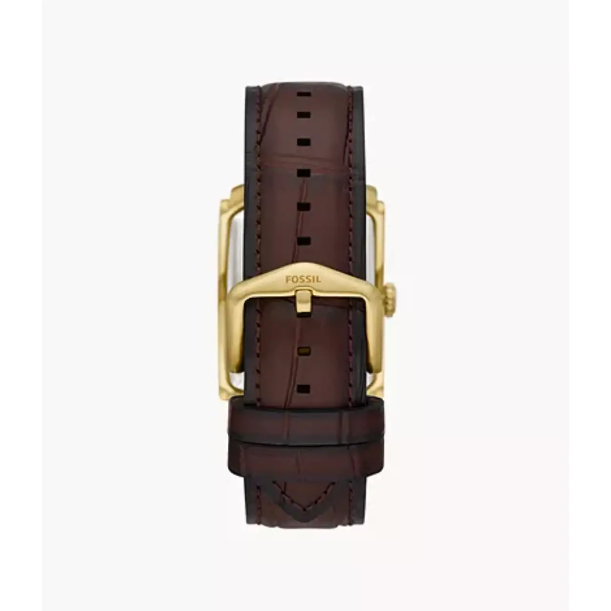 Dit Fossil horloge, uit de Carraway collectie, heeft een vergulde stalen kast en een bruine leren band. De wijzerplaat is zilverkleurige met zwarte romeinse cijfers.