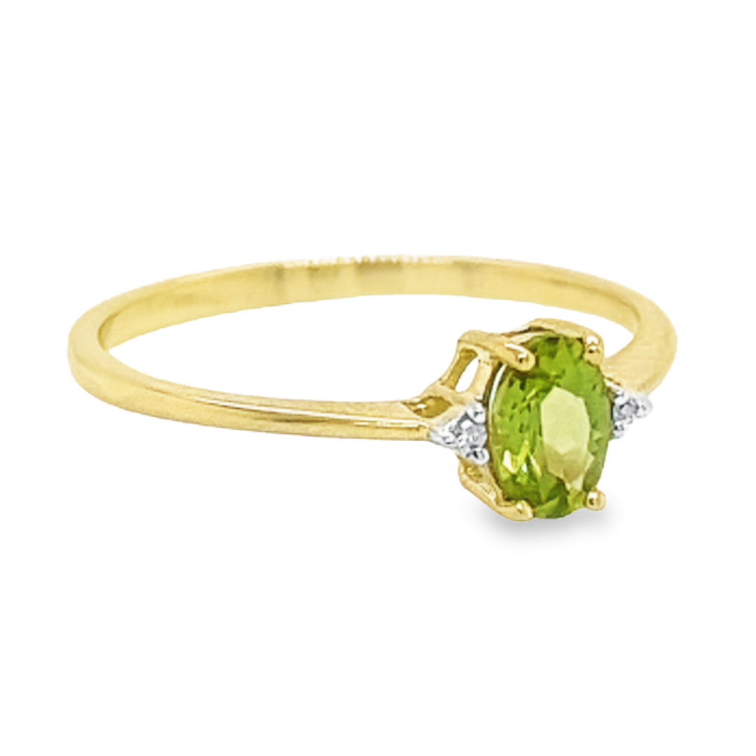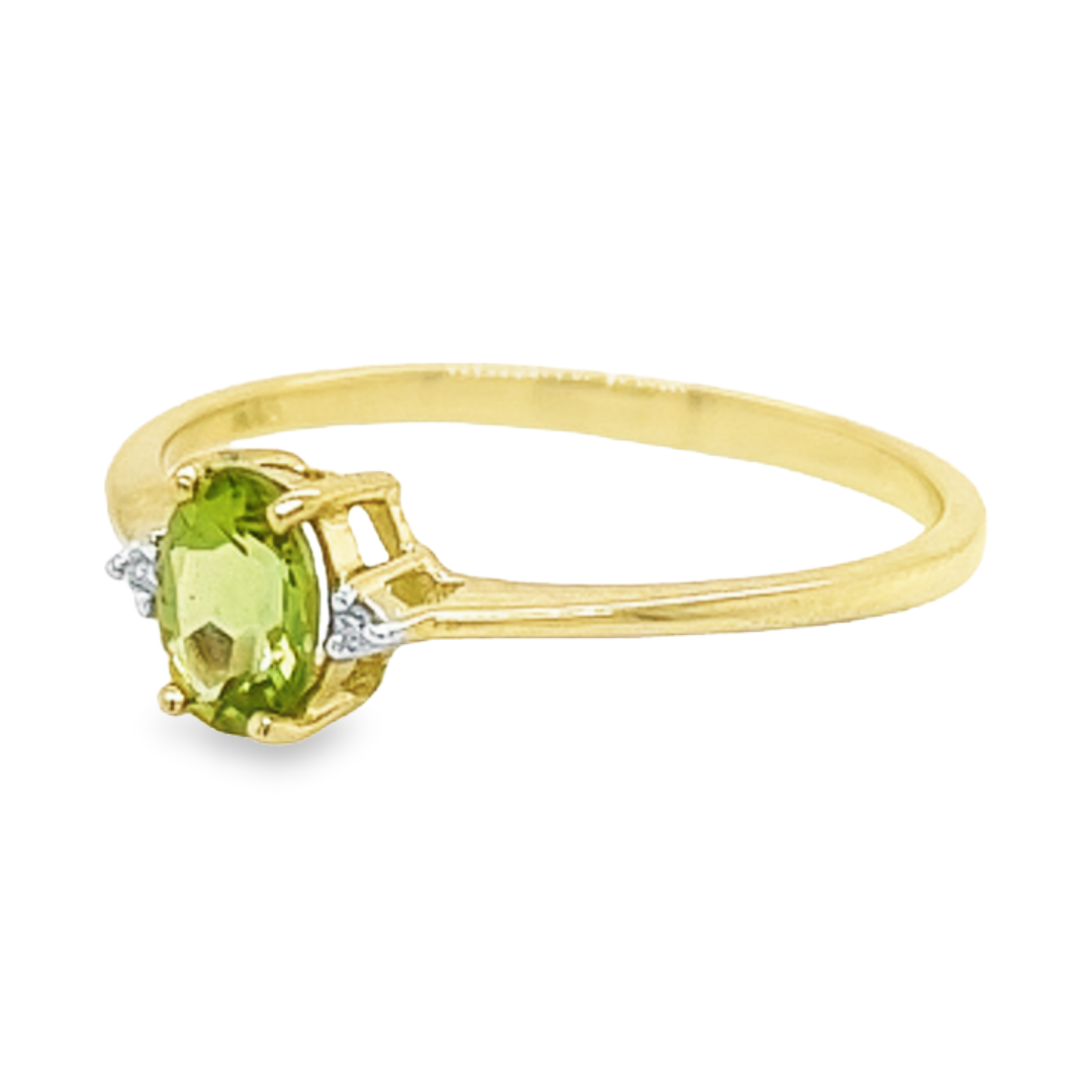 Deze 14-karaats geel gouden ring is ontzettend leuk. De kleurrijke steen is een echte Peridot welke is gezet tussen vier gouden zetpoten. Naast de kleursteen zijn twee diamantjes gezet. Deze ring heeft een schitterende en kleurrijke uitstraling.