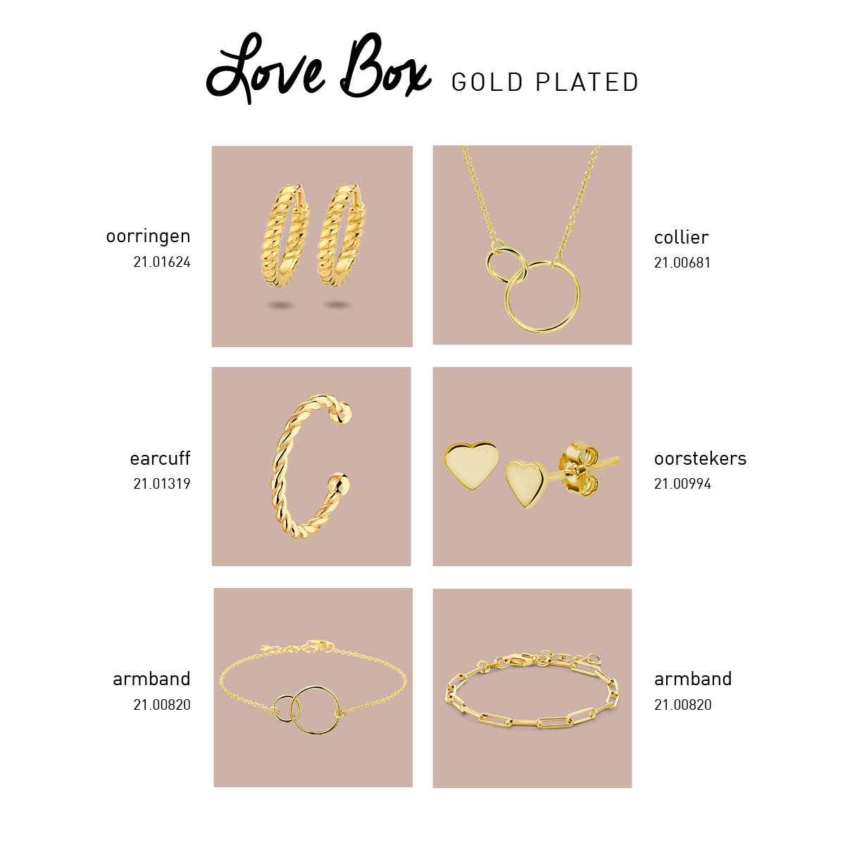 Deze love edition giftbox is een mooi cadeau om te geven aan een geliefde. Deze giftbox bevat verschillende gold plated sieraden: oorringen, collier, earcuff, oorknoppen en twee armbanden. Elk sieraad zit verborgen achter een vakje. Dat zorgt voor extra lang uitpak plezier! De sieraden kunnen met elkaar gecombineerd worden. Kortom: een feestje om cadeau te krijgen! Geen garantie op plating.