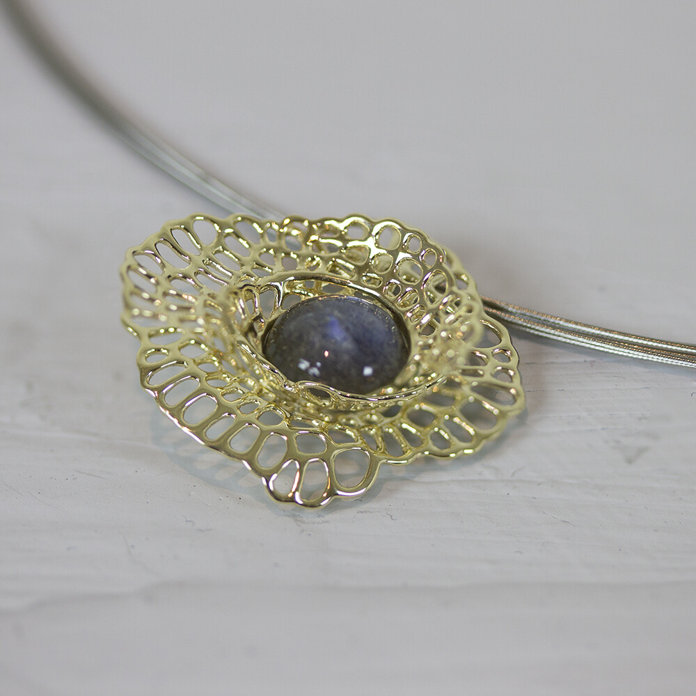 14k Geelgouden Jéh Jewels hanger in vorm van een opengewerkte bloem, met in het midden een ronde, cabouchon geslepen, labradoriet
