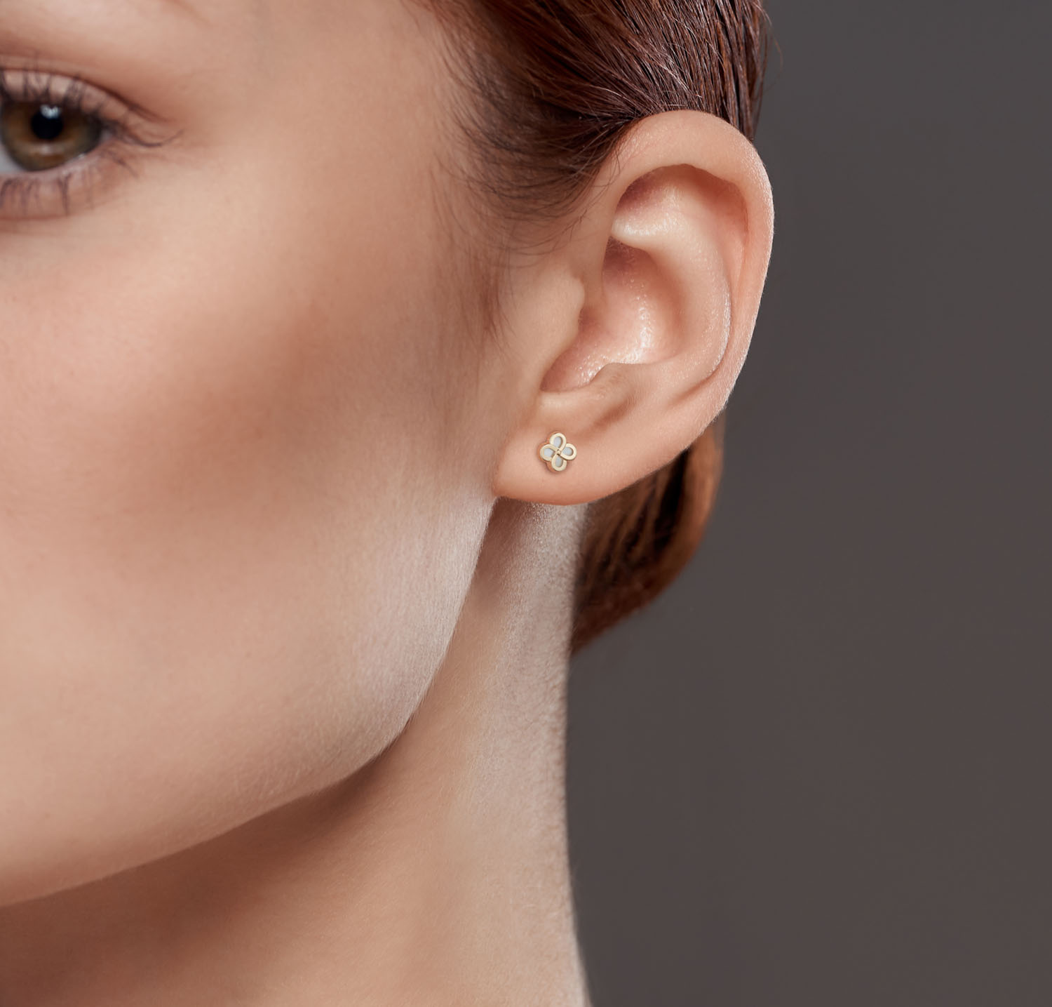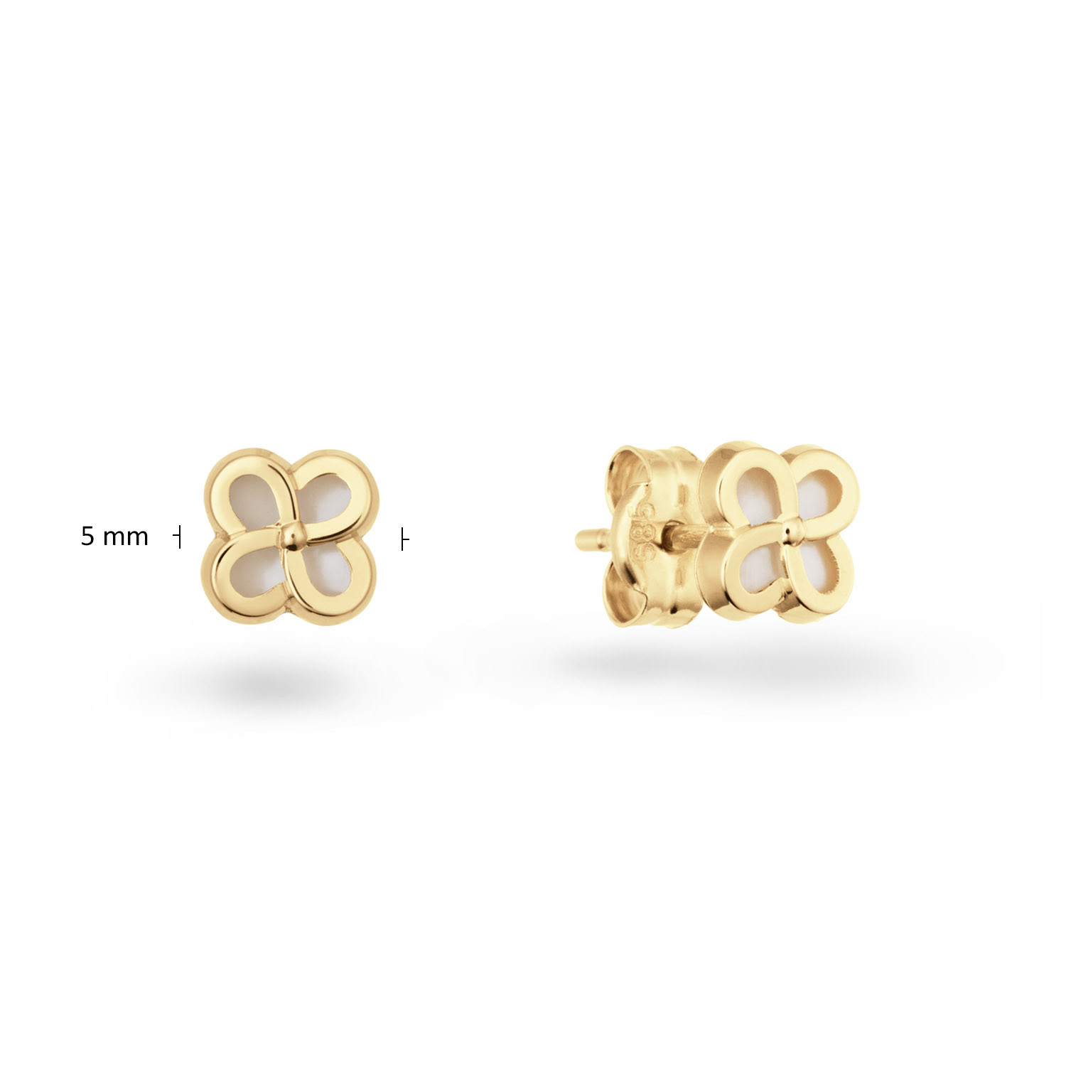 14k geelgouden oorknoppen in vorm van een bloem, ingelegd met parelmoer