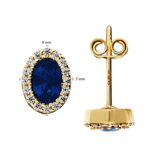 14 karaats Gouden oorknoppen met gezet zirkonia en ovaal synthetisch saffier in een stevige entourage zetting.