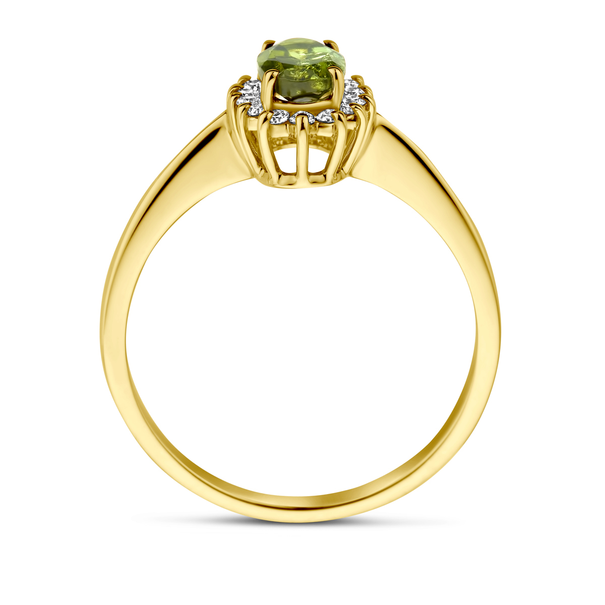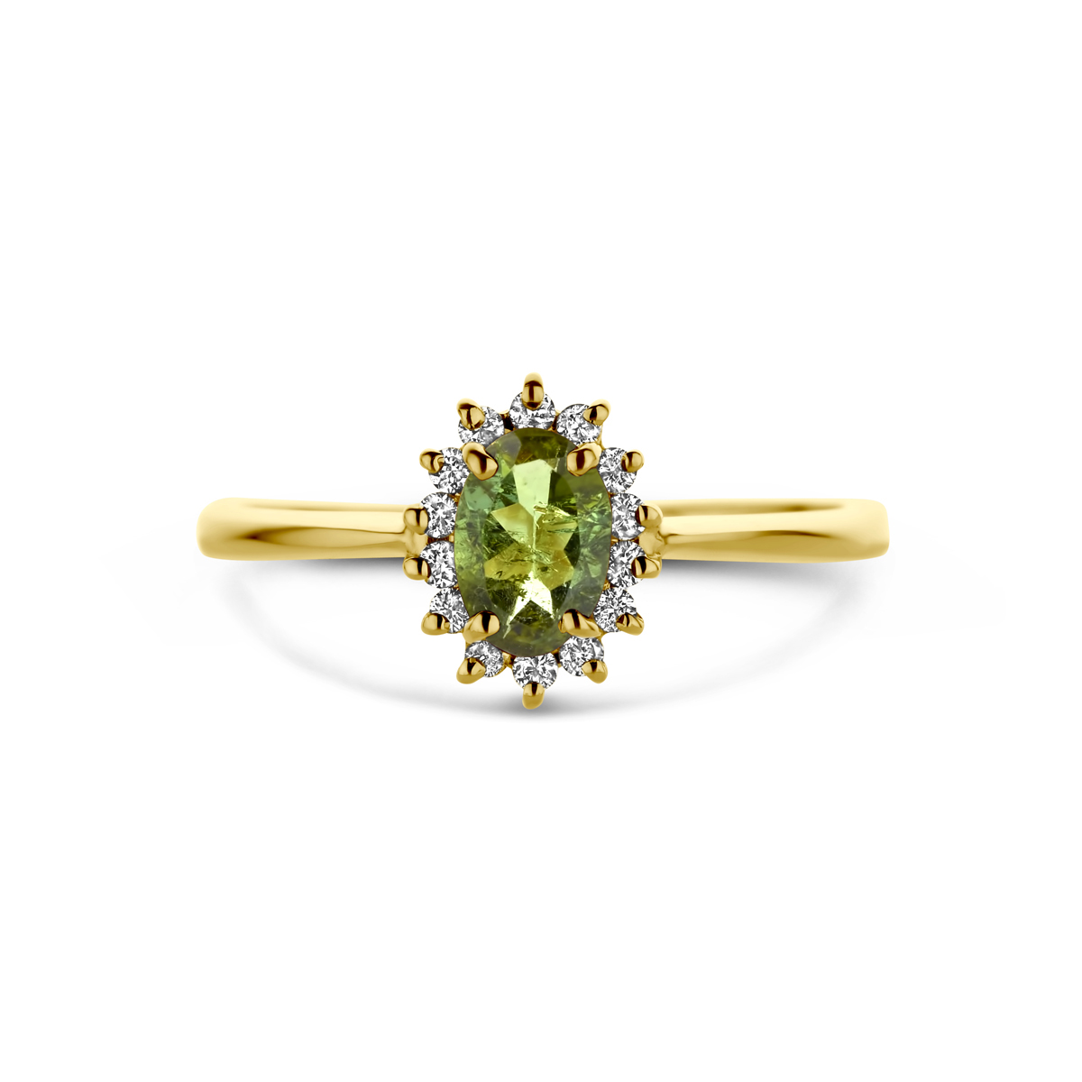 14k Geelgouden ring uitgevoerd met toermalijn en diamant. De ring heeft een breedte van 9x7mm. Het diamantgewicht is 0.11ct.