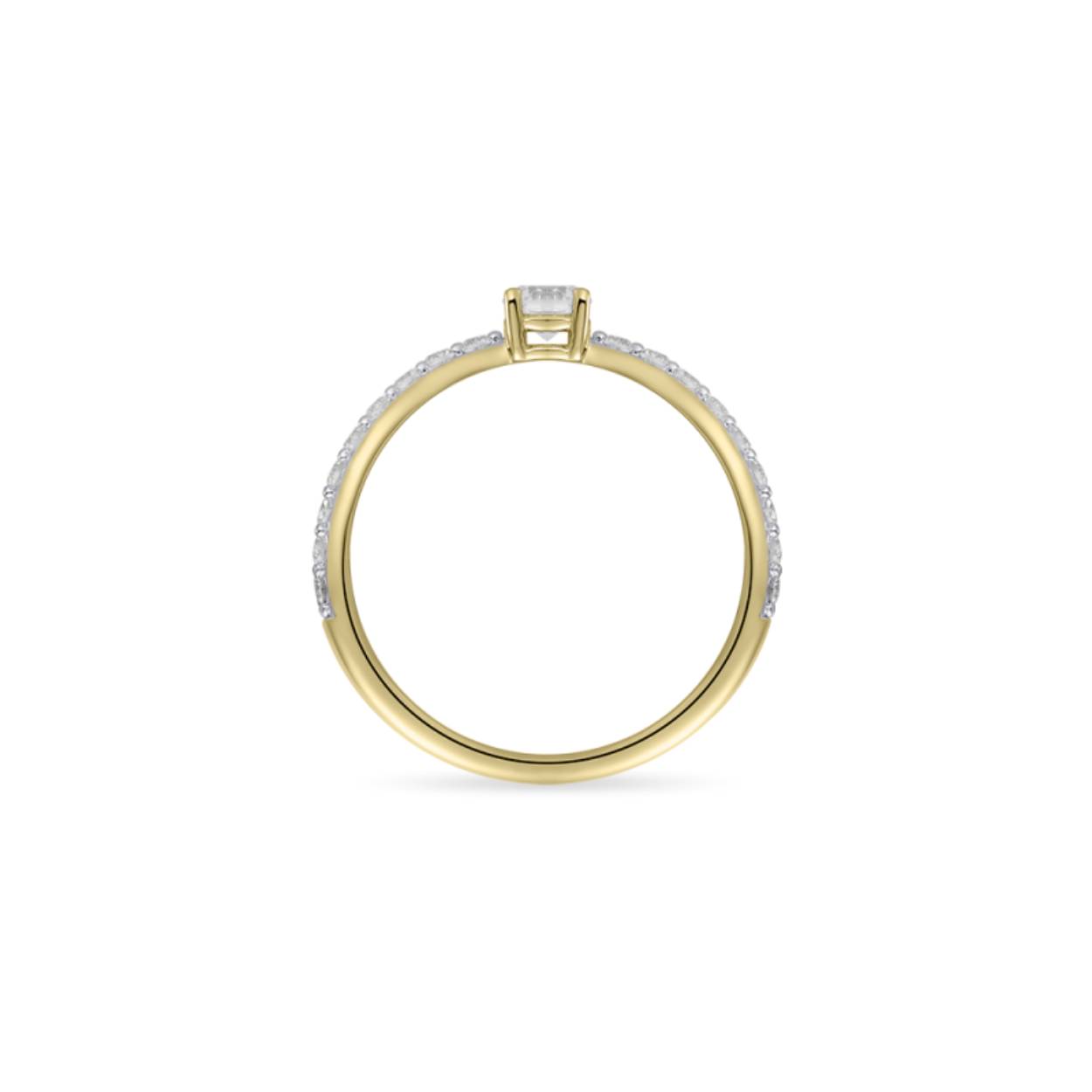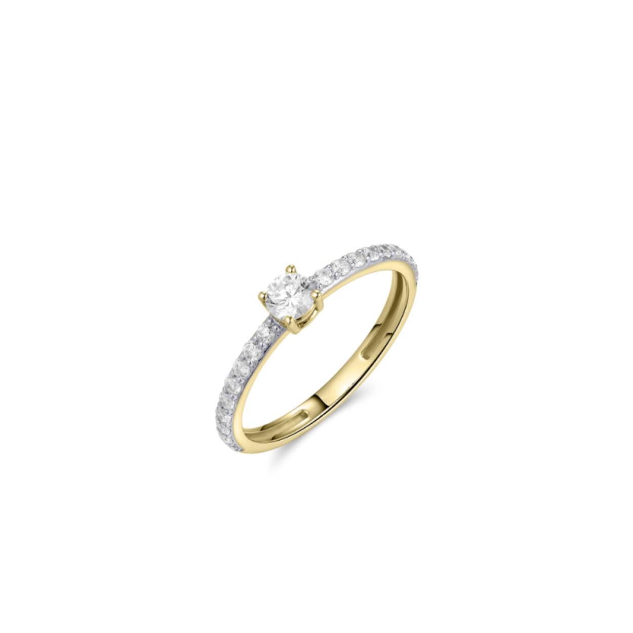 14k gouden rijring met zirkonia. De middensteen is groter 4mm, en apart gezet in een chaton met vier zetpoten.