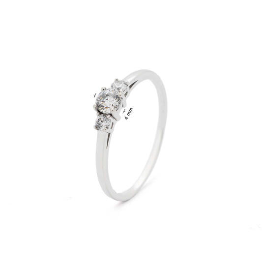 14k witgouden ring met drie zirkonia's, elk apart gezet in een chaton met vier zetpoten