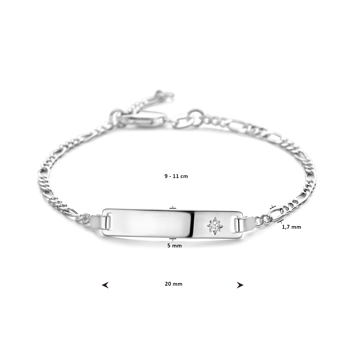 Zilveren graveerarmband met zirkonia. De lengte bedraagt 16cm met 2cm extensie. De breedte van de graveerplaat bedraagt 5mm.