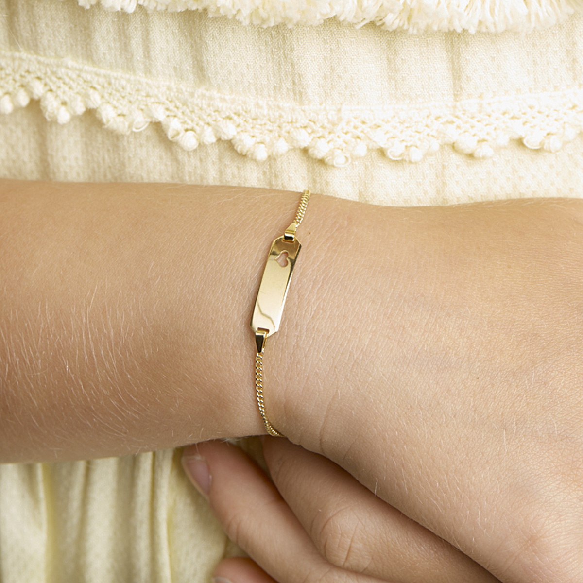 Geelgouden graveerarmband met een poli afwerking en een gestanst hartje. De graveerplaat heeft een dikte van 0.5mm.