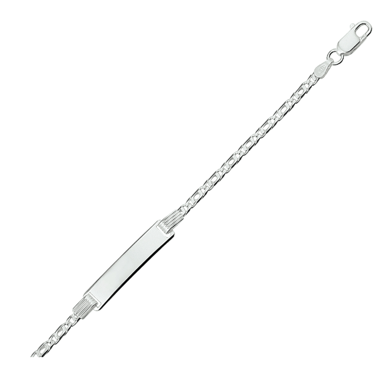 Zilveren naamplaatarmband waar in gegraveerd kan worden. De armband heeft een valkenoog schakel en heeft een totale lengte van 18cm. De breedte van de plaat is 6mm.