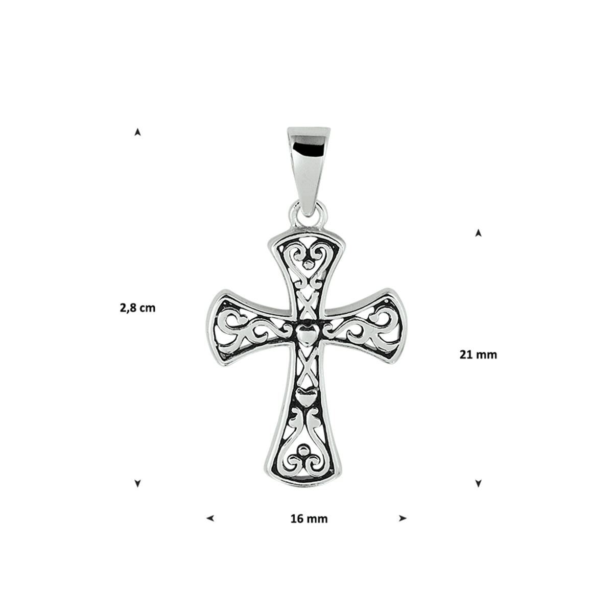 Beschrijving: Zilver geoxideerde filigrain hanger in de vorm van een kruis uitgevoerd met een stevig hangoog. Het kruis heeft een afmeting van 21x16mm. De hanger is ook goed te combineren met een zilver collier uit onze collectie, op verzoek kunnen wij deze voor u oxideren net als de hanger.