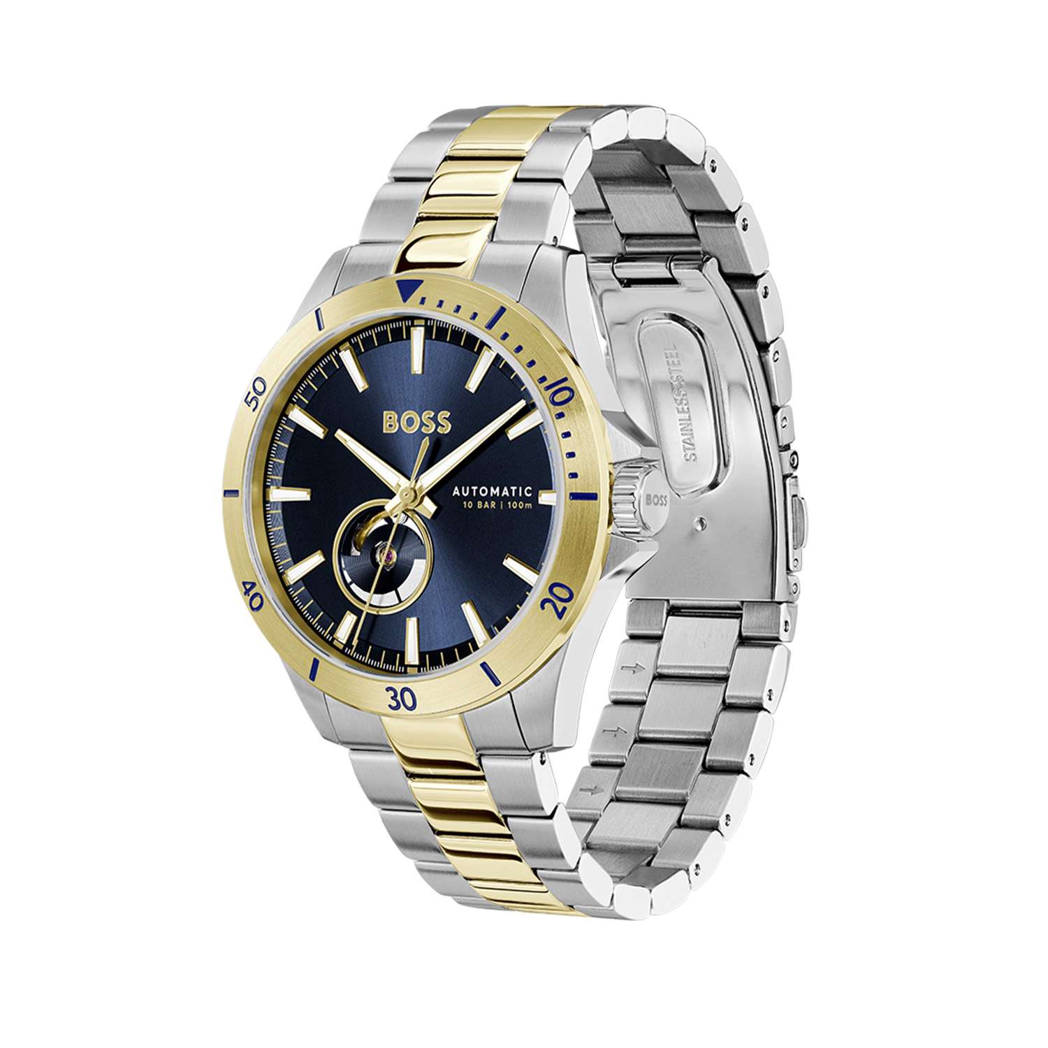 Dit horloge van het merk BOSS by Hugo Boss is voorzien van een automatisch 82S2 Miyota uurwerk. Deze laad zich op door middel van beweging van de pols om te zetten in spanning op een veer. Dit uurwerk heeft een gang reserve van ongeveer 42 uur, maar kan ook door middel van kroon slagen worden opgewonden. De wijzerplaat is voorzien van een zogenoemd open hart waar u de balans en één van de 21 robijnen kunt bewonderen. Het uurwerk is accuraat tot een bovengemiddelde 20~40 seconden per dag. Om de het horloge waterdicht te behouden tot een druk van 10atm behoort de kroon te zijn dichtgeschroefd.