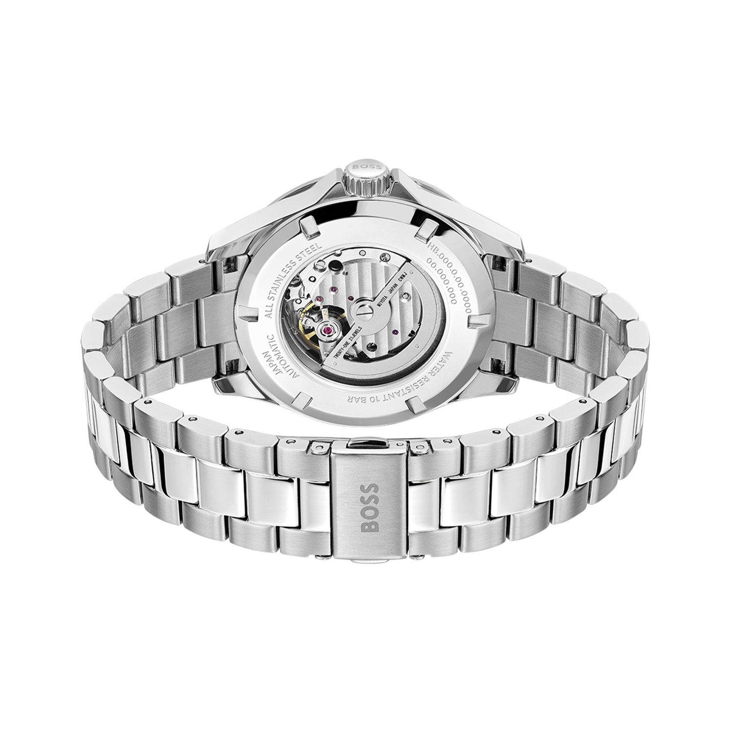 Dit horloge van het merk BOSS by Hugo Boss is voorzien van een automatisch 82S1 Miyota uurwerk. Deze laad zich op door middel van beweging van de pols om te zetten in spanning op een veer. Dit uurwerk heeft een gang reserve van ongeveer 42 uur, maar kan ook door middel van kroon slagen worden opgewonden. De wijzerplaat is voorzien van een zogenoemd open hart waar u de balans en één van de 21 robijnen kunt bewonderen. Het uurwerk is accuraat tot een bovengemiddelde 20~40 seconden per dag. Om de het horloge waterdicht te behouden tot een druk van 10atm behoort de kroon te zijn dichtgeschroefd.