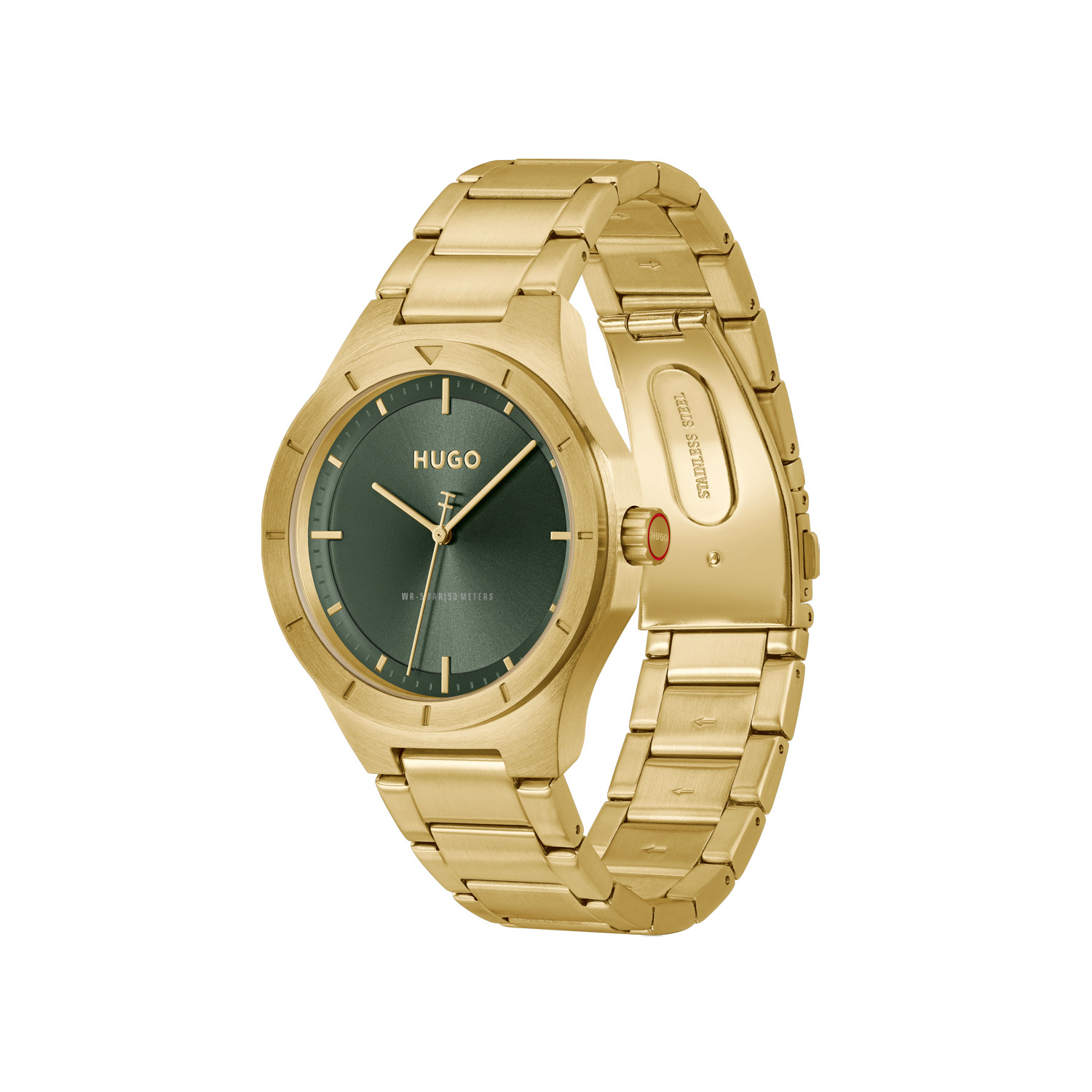 Dit stijlvolle Hugo herenhorloge HU1530449 combineert een strak design met moderne elegantie, heeft een krachtige uitstraling en een tijdloze look. Perfect voor zowel zakelijke als casual outfits. Het goudkleurige horloge is uitgevoerd in hoogwaardig staal en draagt comfortabel om de pols. De duidelijke wijzerplaat en verfijnde afwerking onderstrepen de premium kwaliteit waar Hugo om bekendstaat. Een ideale keuze voor de man die houdt van een moderne, zelfverzekerde stijl. Het sportief stoer ogende herenhorloge heeft een groene wijzerplaat, een mineraalglas, een doorsnee van 42mm en is 5ATM.