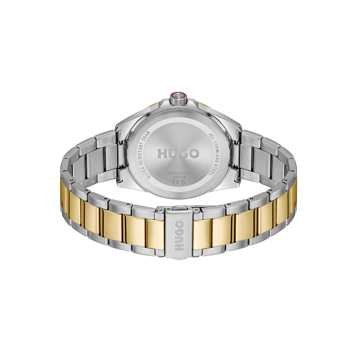 Dit Hugo herenhorloge HU1530452 straalt klasse en minimalisme uit. De bicolor stalen kast zorgt voor een elegante en tijdloze uitstraling, perfect passend bij zowel formele als casual outfits. Het model maakt dit horloge tot een veelzijdig accessoire voor elke gelegenheid. De mat glanzende bicolor stalen schakelband geeft het horloge een luxe en comfortabele pasvorm. Het herenhorloge heeft een zwarte bewerkte wijzerplaat, een mineraalglas, een doorsnee van 41mm en is 3ATM.