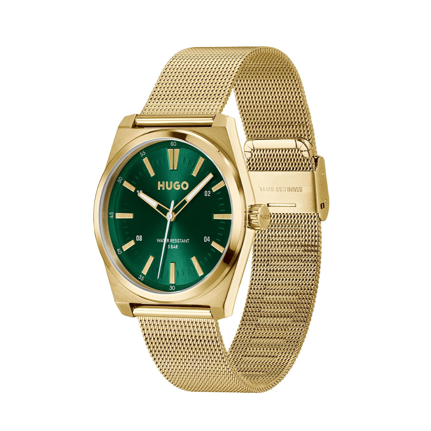 Dit HUGO horloge uit de ARK serie met artikelnr. HU1530439 is ontworpen voor ieder die zijn stijl gebruikt om zijn unieke persoonlijkheid uit te drukken. Het horloge kenmerkt zich door zijn stalen goudkleurige hoekige horlogekast. Het ontwerp is opvallend vanwege zijn stoere 'kijk mij nou eens' uitstaling en de wijzers ingelegd met lumibrite op de groene sunray wijzerplaat met goedkleurige accenten. Aan de kast zit een goudkleurige milanese band met een drukpsluiting. Het klassieke herenhorloge heeft een mineraalglas, een doorsnee van 40mm en is 5ATM.