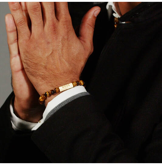 Tijgeroog kralenarmband, van het merk Hugo Boss, met een vergulde stalen magneetsluiting