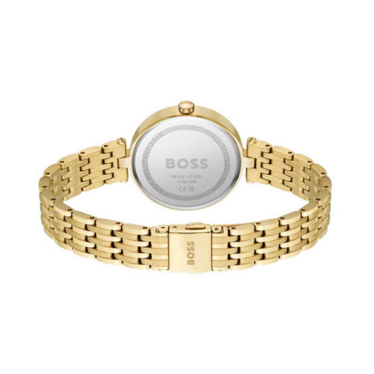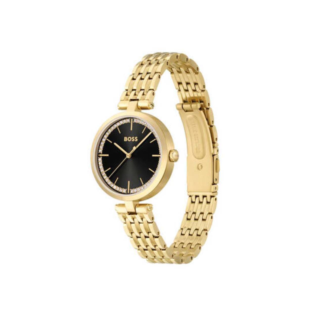 Dit Boss by Hugo Boss horloge, uit de Essena collectie, heeft een vergulde stalen band en kast. De wijzerplaats is zwart met goudkleurige indexen en wijzers. Op de wijzerplaat zijn glinsterende steentjes geplaatst voor een extra chique uitstraling.