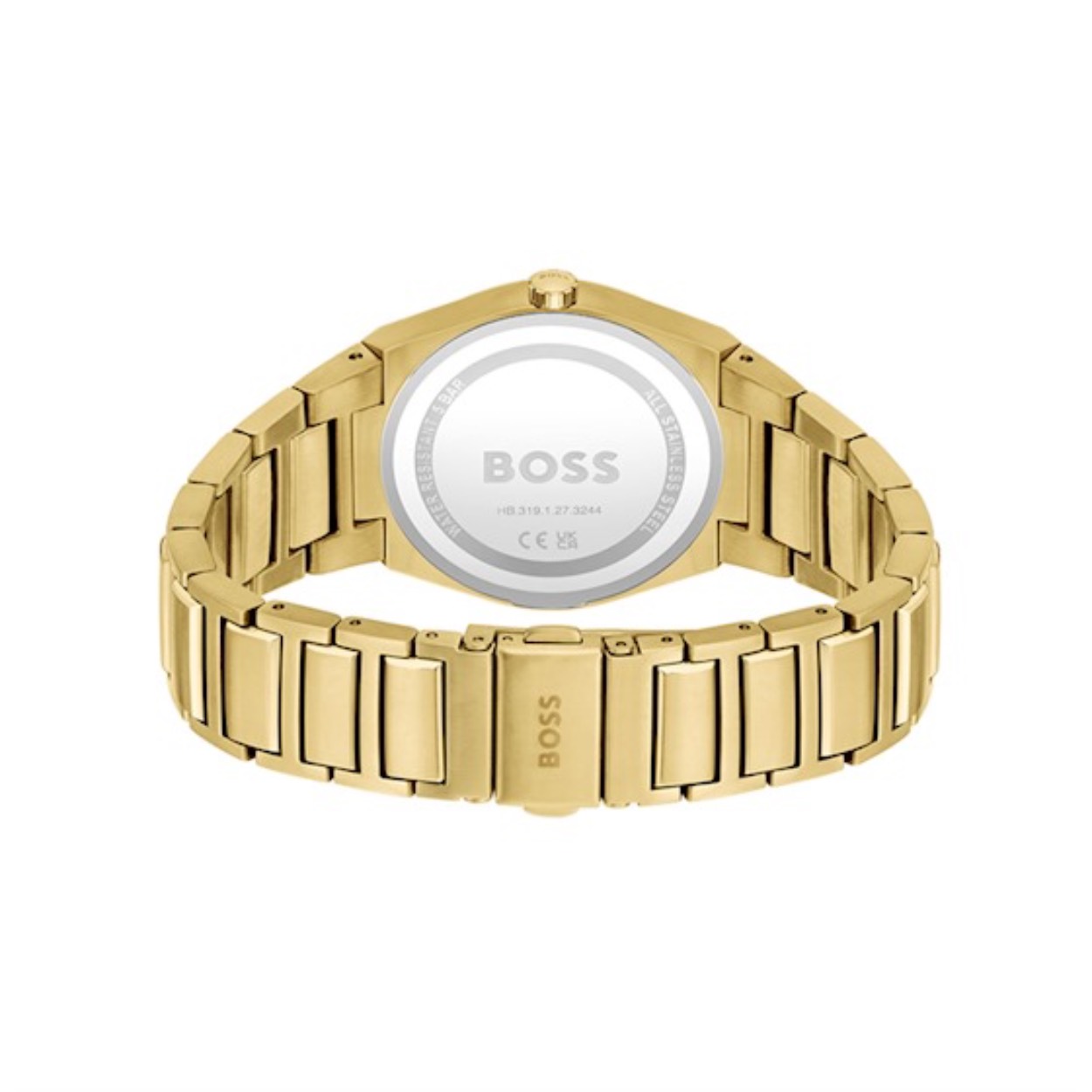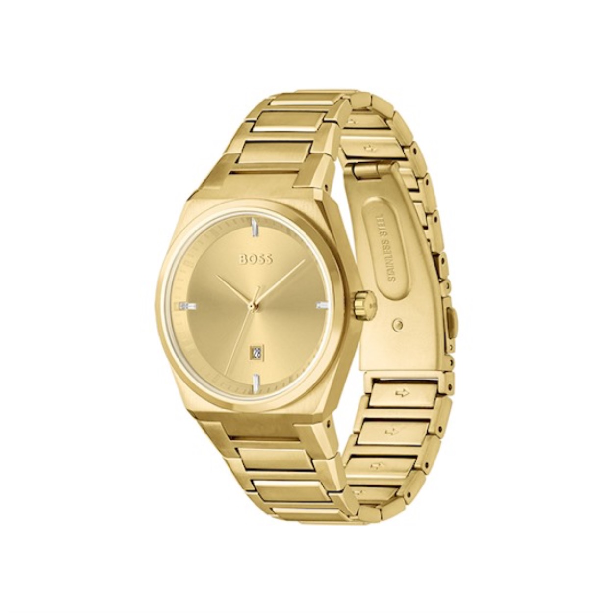 Dit Boss by Hugo Boss horloge, uit de Steer collectie, heeft een vergulde stalen band en kast. De wijzerplaat is sunray goudkleurig met baguette vormige steentjes als indexen.