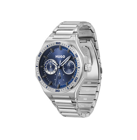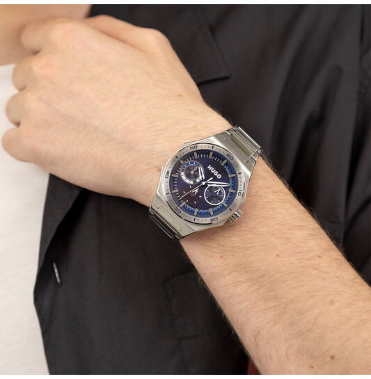 Dit HUGO by Hugo Boss horloge, uit de #GRAIL SPORT collectie, heeft een stalen band en kast. De wijzerplaat is donkerblauw, met grijze indexen en witte wijzers. Het horloge is voorzien van een dag, datum en 24-uurs aanduiding