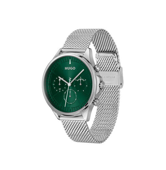 Dit HUGO by Hugo Boss horloge, uit de #SMASH collectie, heeft een stalen kast en milanese band. De wijzerplaat is groen met wit/zilveren wijzers. Het horloge is voorzien van een dag, datum en 24-uurs aanduiding.