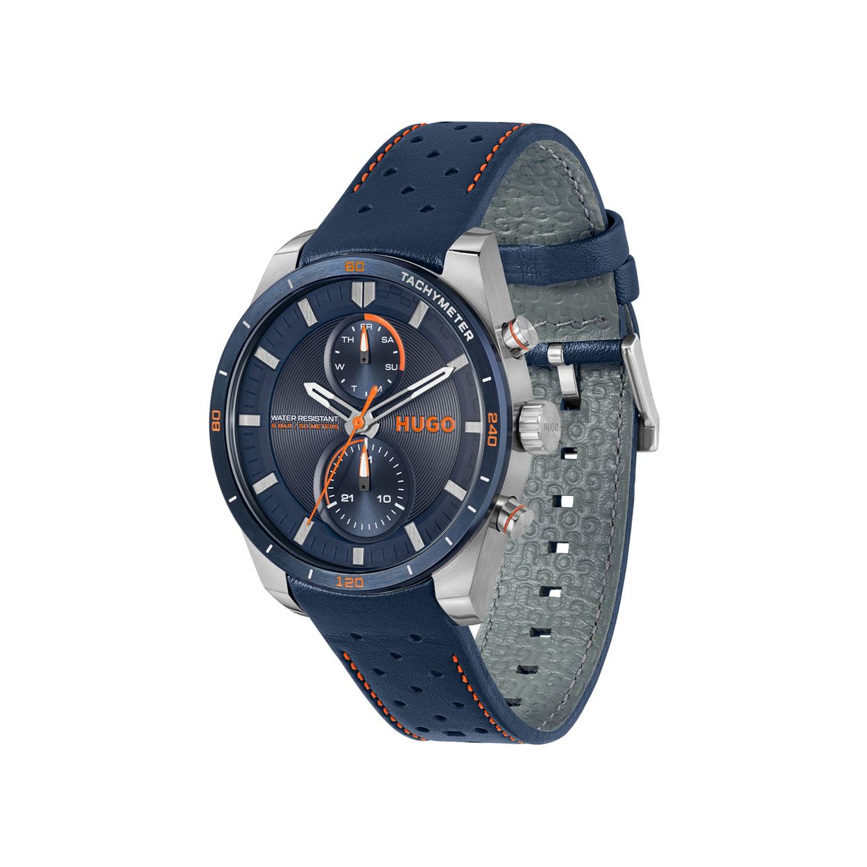 Dit HUGO horloge uit de FAST serie met artikelnr. HU1530371 is ontworpen voor de man met durf en die volledig zichzelf is in zijn eigen unieke stijl. Het herenhorloge kenmerkt zich door zijn stalen ronde horlogekast met blauwe bedrukte bezel. Het ontwerp is opvallend vanwege zijn stoere 'kijk mij nou eens' uitstaling, de oranje secondewijzer en de oranje en witte accenten op de blauwe wijzerplaat. Het herenhorloge heeft een dag,- datumaanduiding. Aan de kast zit een blauwe lerenband met een gespsluiting. Het nette ogende herenhorloge heeft een mineraalglas, een doorsnee van 44mm en is 5ATM.