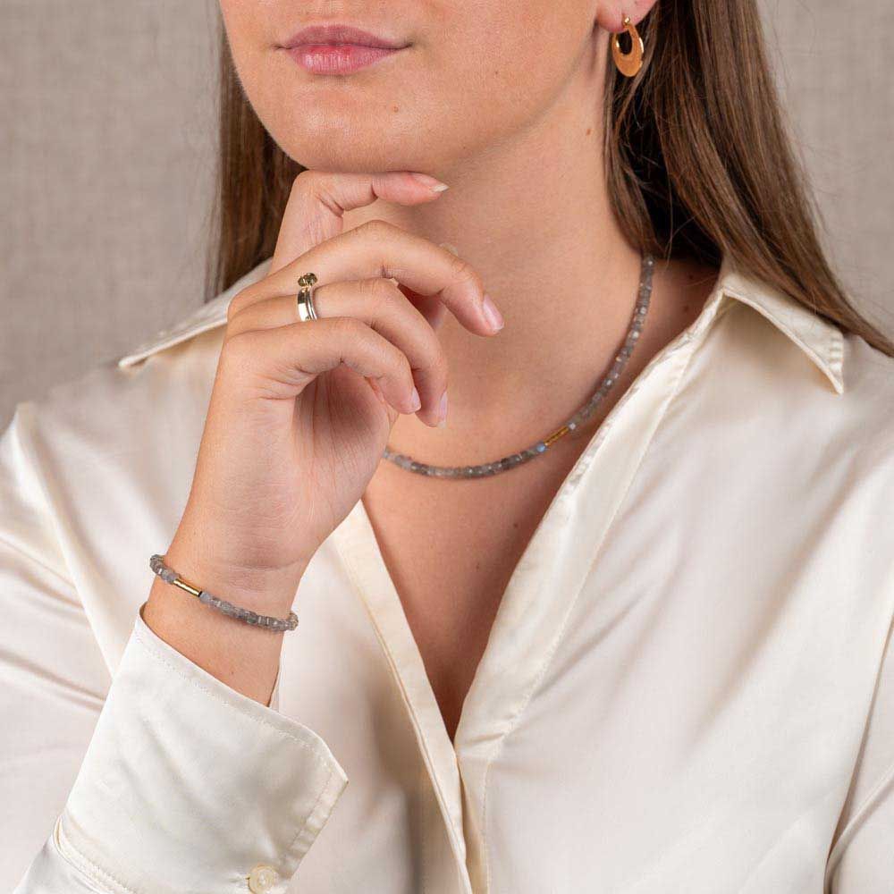 Armband gemaakt van de edelsteen Labradoriet in combinatie met Goldfilled buisjes.