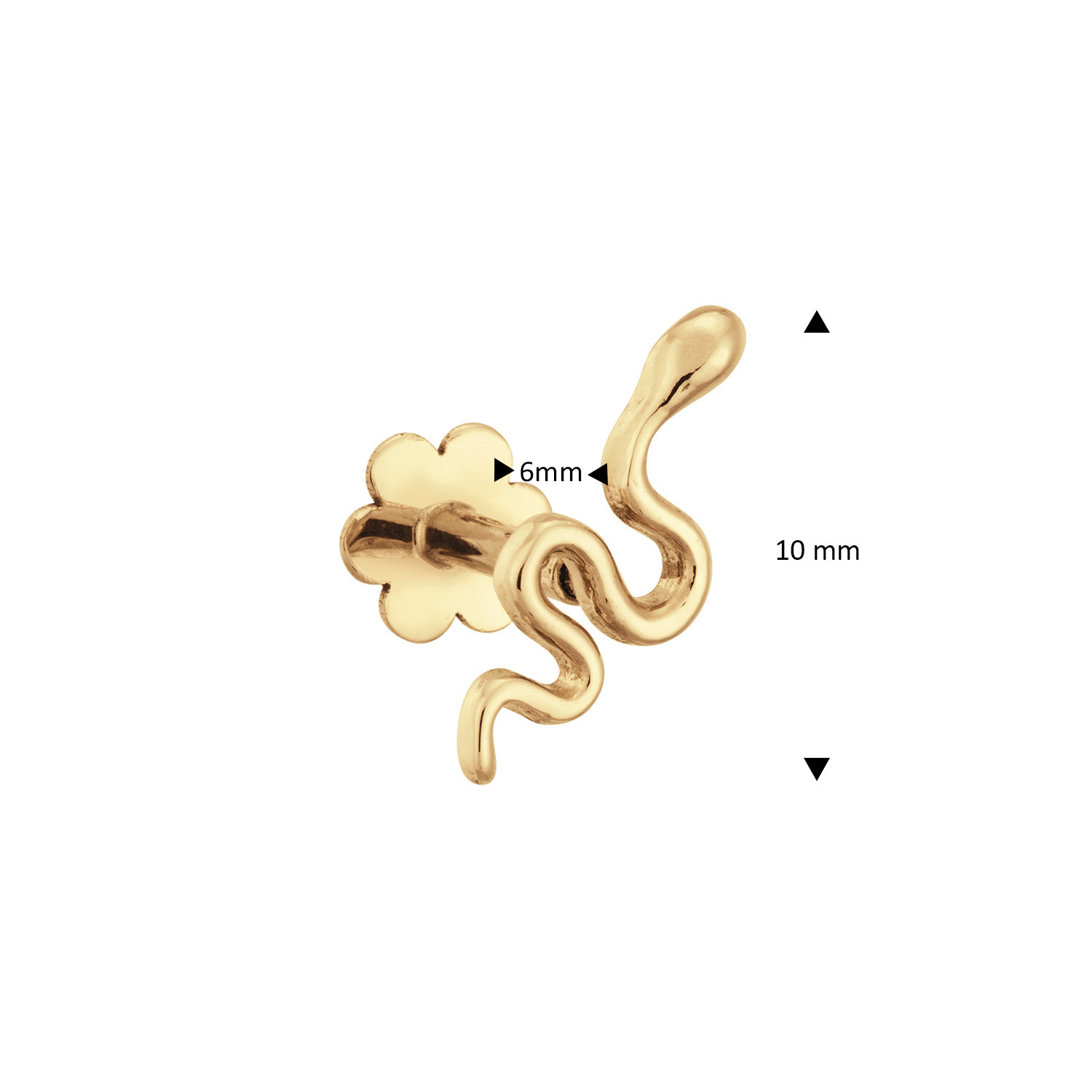 De 14 karaat gouden Snake piercing met 2 schroefstaafjes en een bloemetje als achterkant, maken het in- en uitdoen heel makkelijk! Je kunt ze ook inhouden als je gaat slapen. Voeg als finishing touch een piercing toe aan je Jackie earparty!