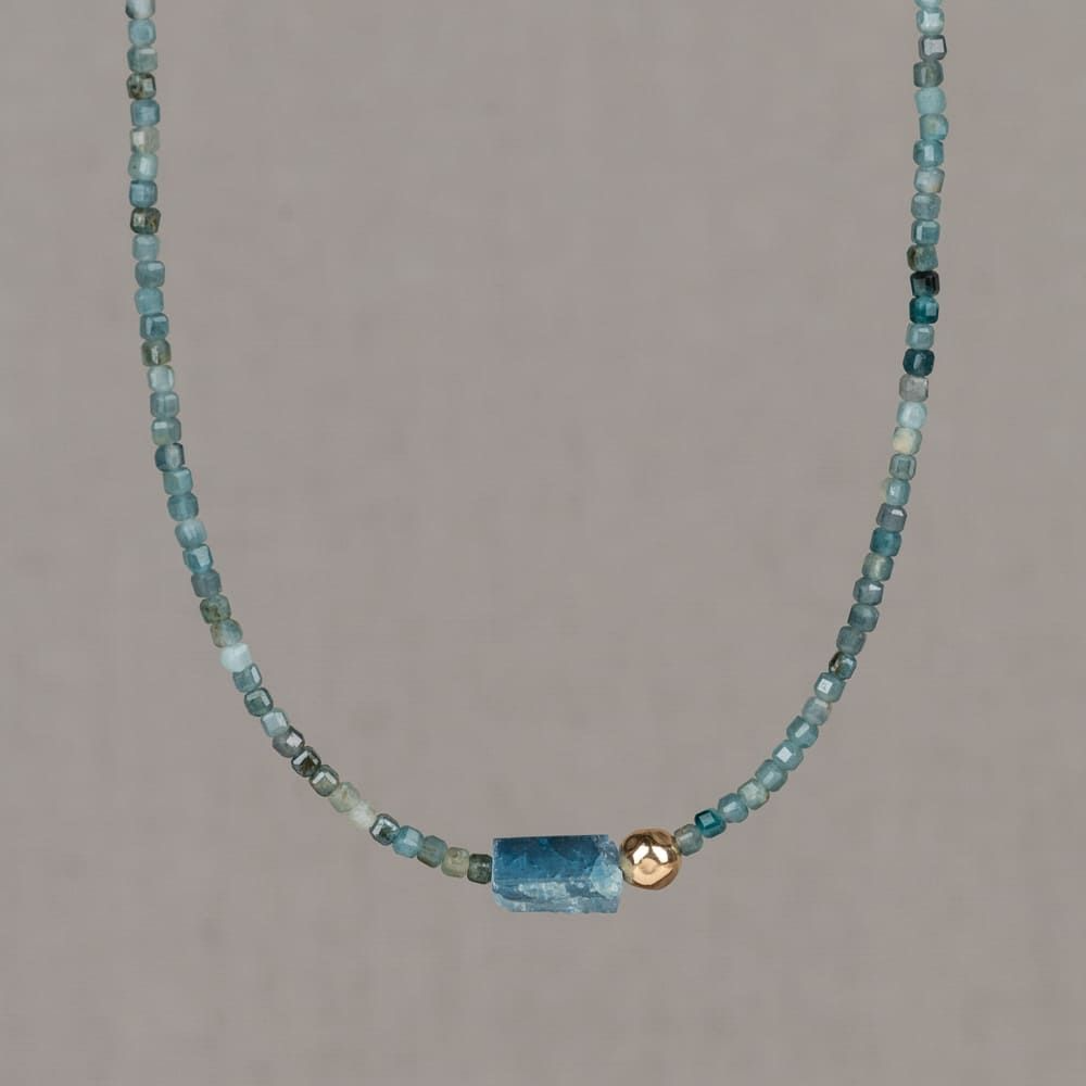 Collier gemaakt van Toermalijn met in het midden een ruwe Aquamarijn en een Goldfilled bolletje. Iedere edelsteen is uniek en kan verschillen qua vorm.