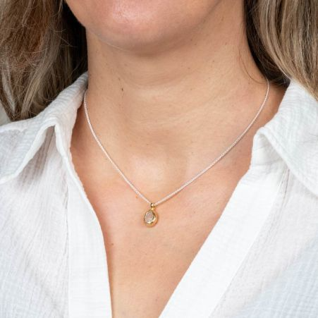 Collier gemaakt van 925 sterling zilver aan het collier hangt een gefaceteerde maansteen omsloten met zilver verguld.