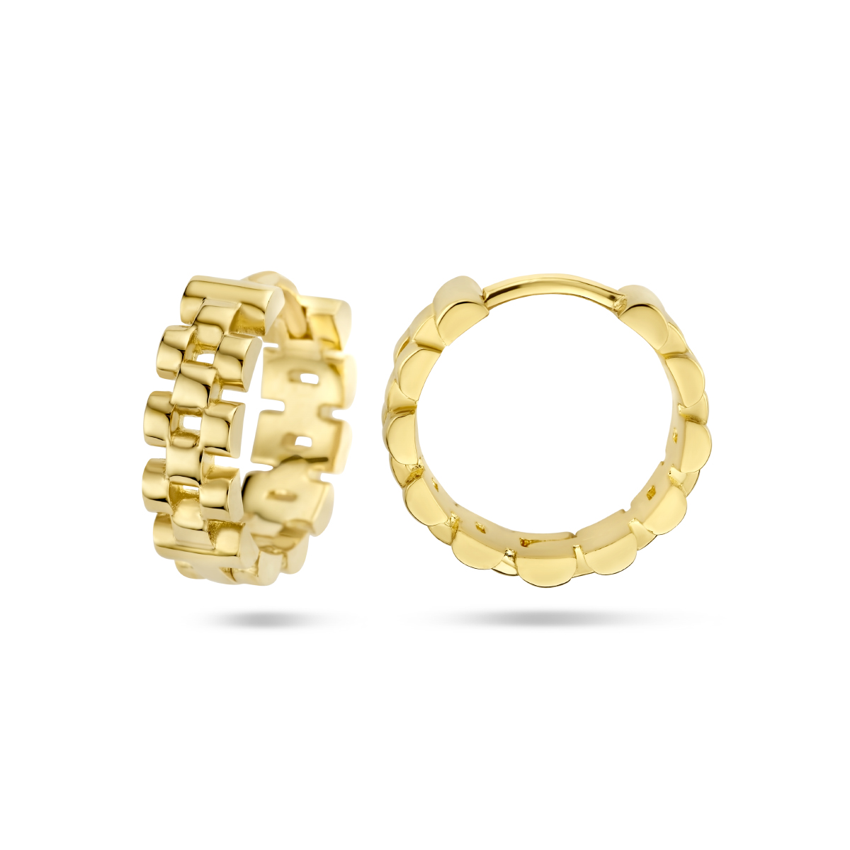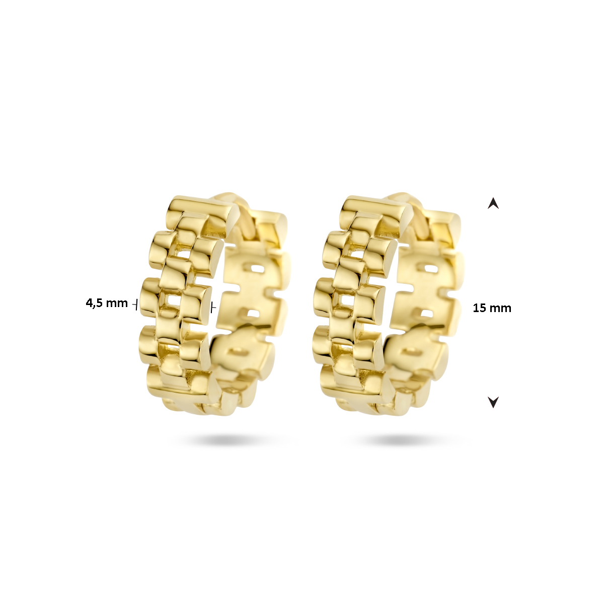 14k Geelgouden klapoorringen met een schakelmotief. De oorringen hebben een breedte van 4.5mm en zijn voorzien van een schakelmotief