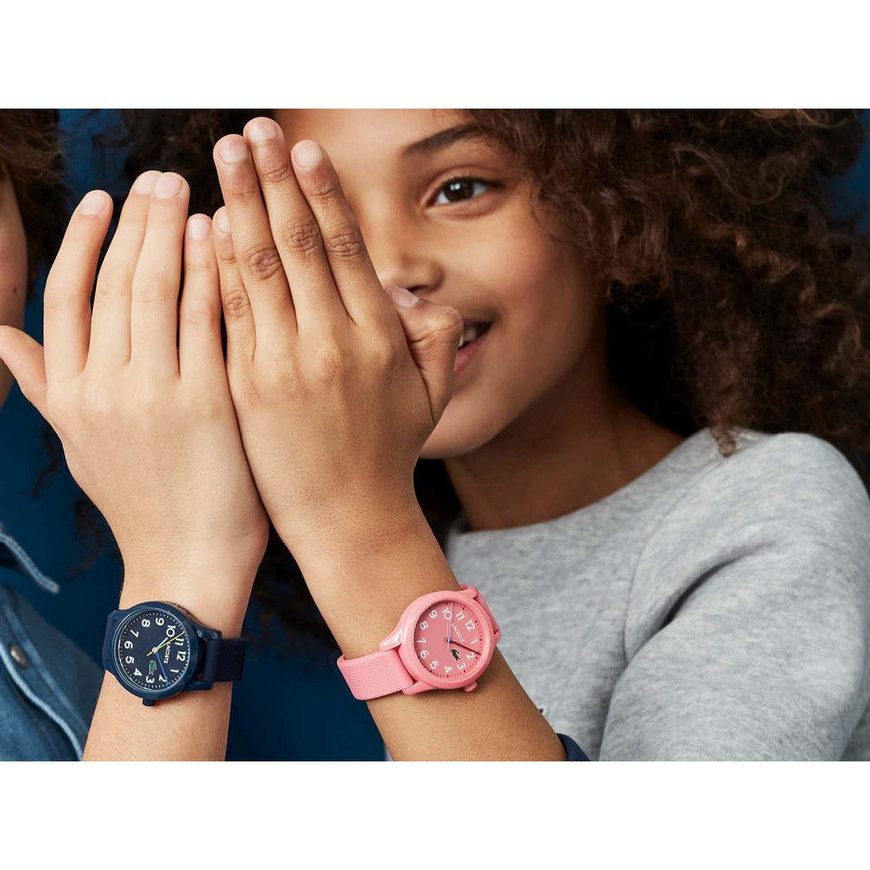 Lacoste kinderhorloge met een roze kunststof kast en siliconen band. De wijzerplaat is roze met witte indexen.