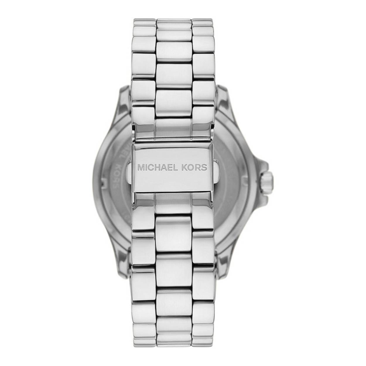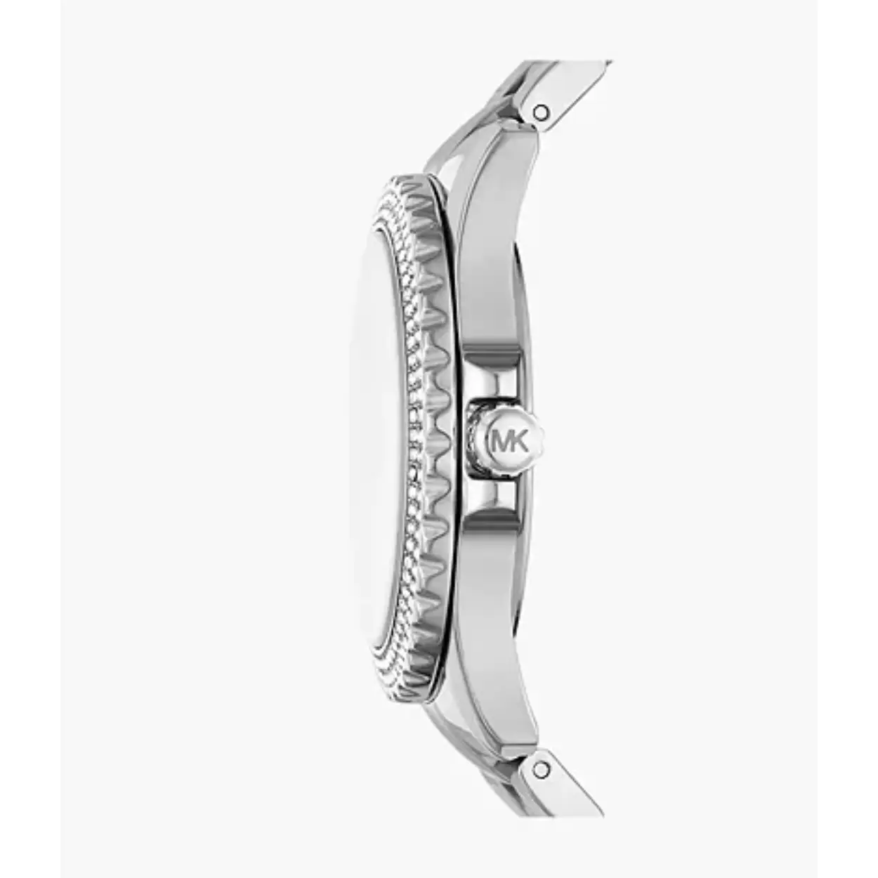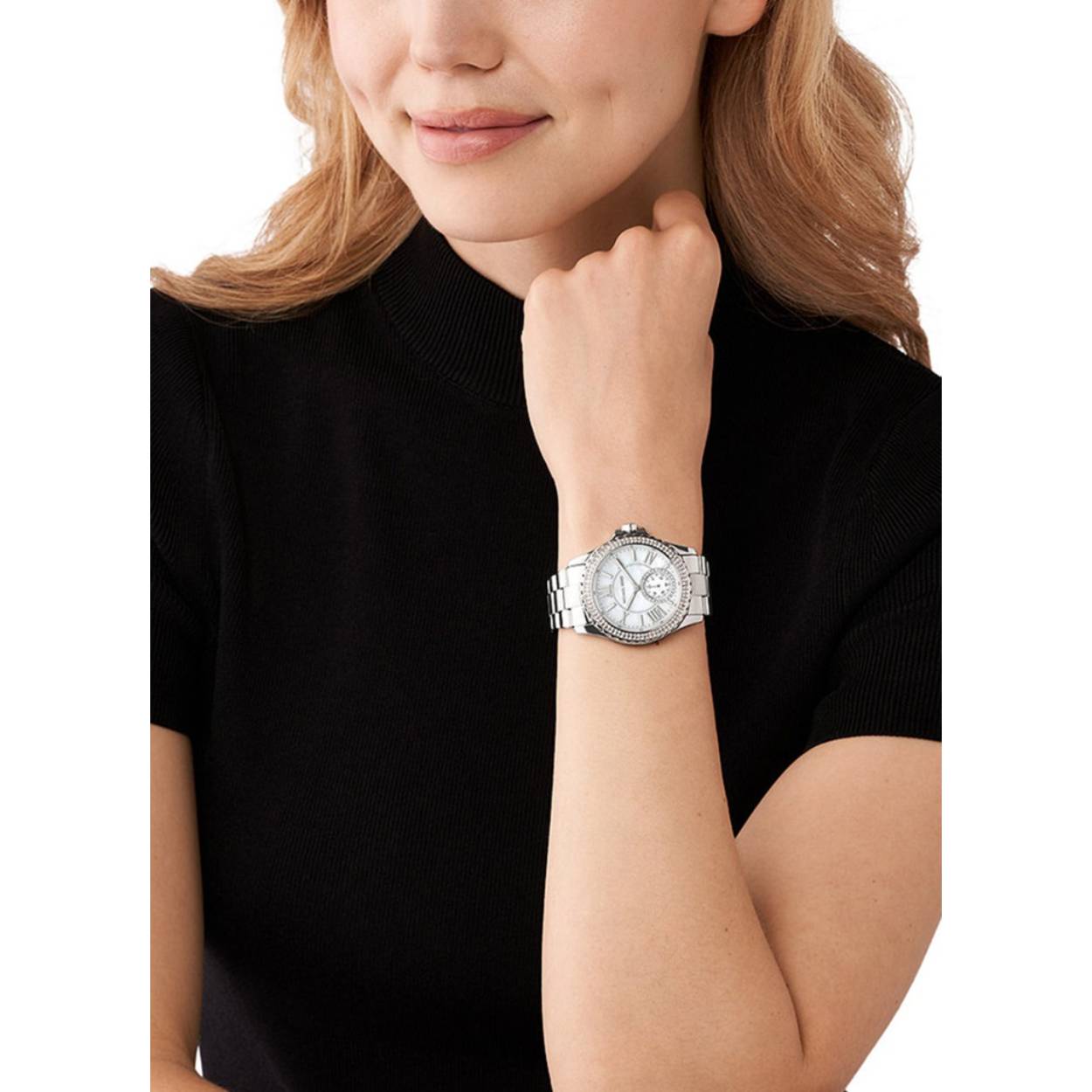 Dit Michael Kors horloge, uit de Everest collectie, heeft een stalen band en kast met een bezel bezet met glinsterende steentjes.