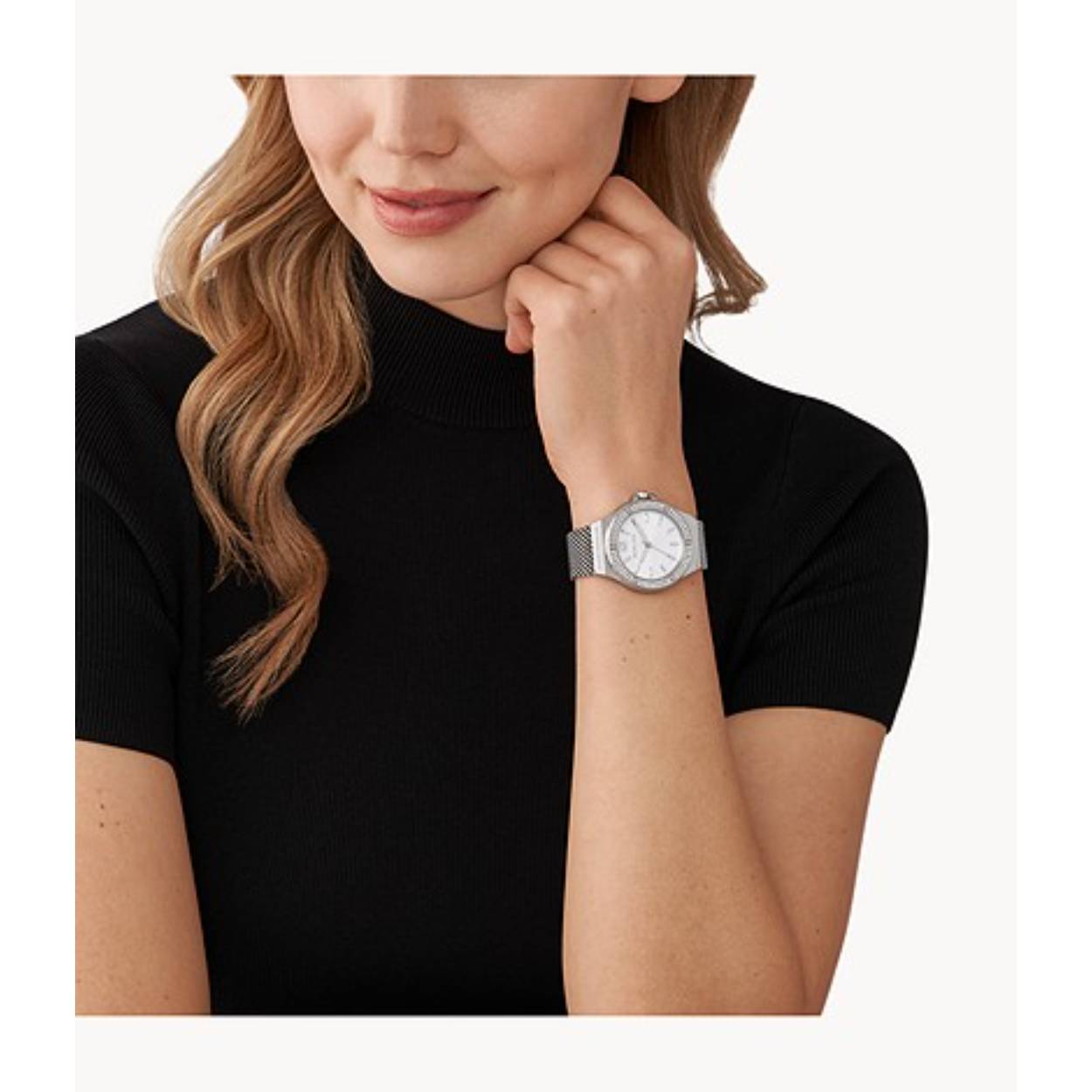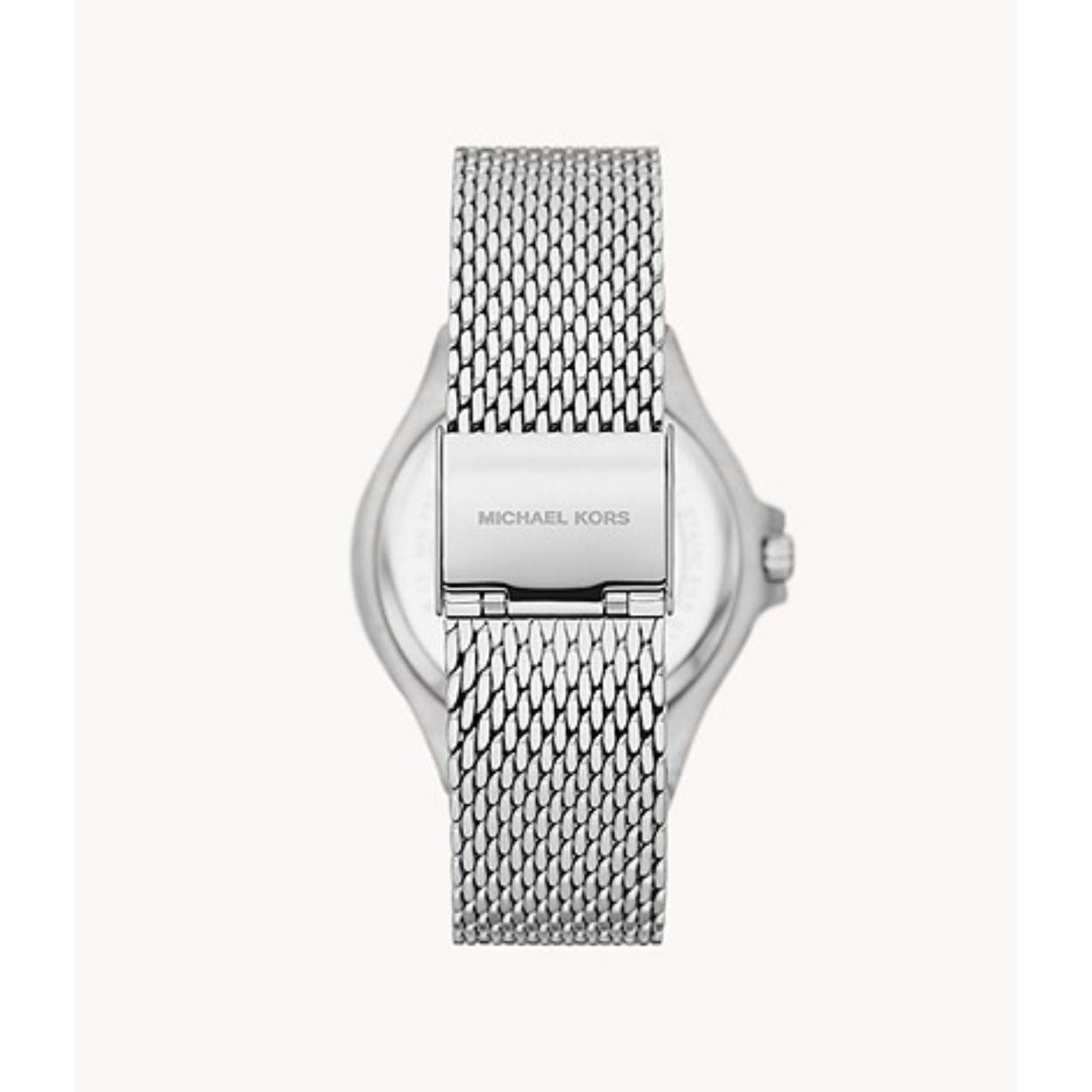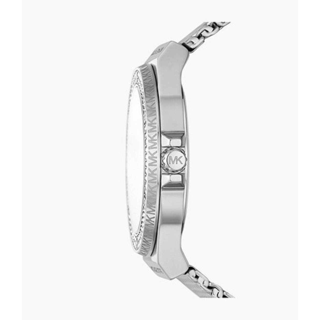 Dit Michael Kors horloge, uit de Lennox collectie, heeft een stalen kast met glinsterende steentjes geplaatst in de lunnette en een stalen milanese band. De wijzerplaat is mat zilverkleurig met wit/zilverkleurige indexen en wijzers.