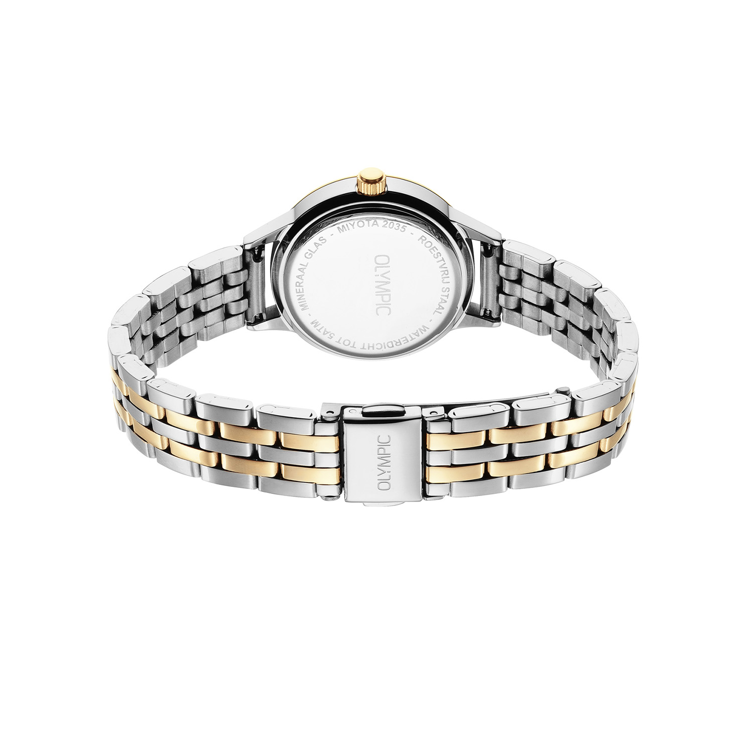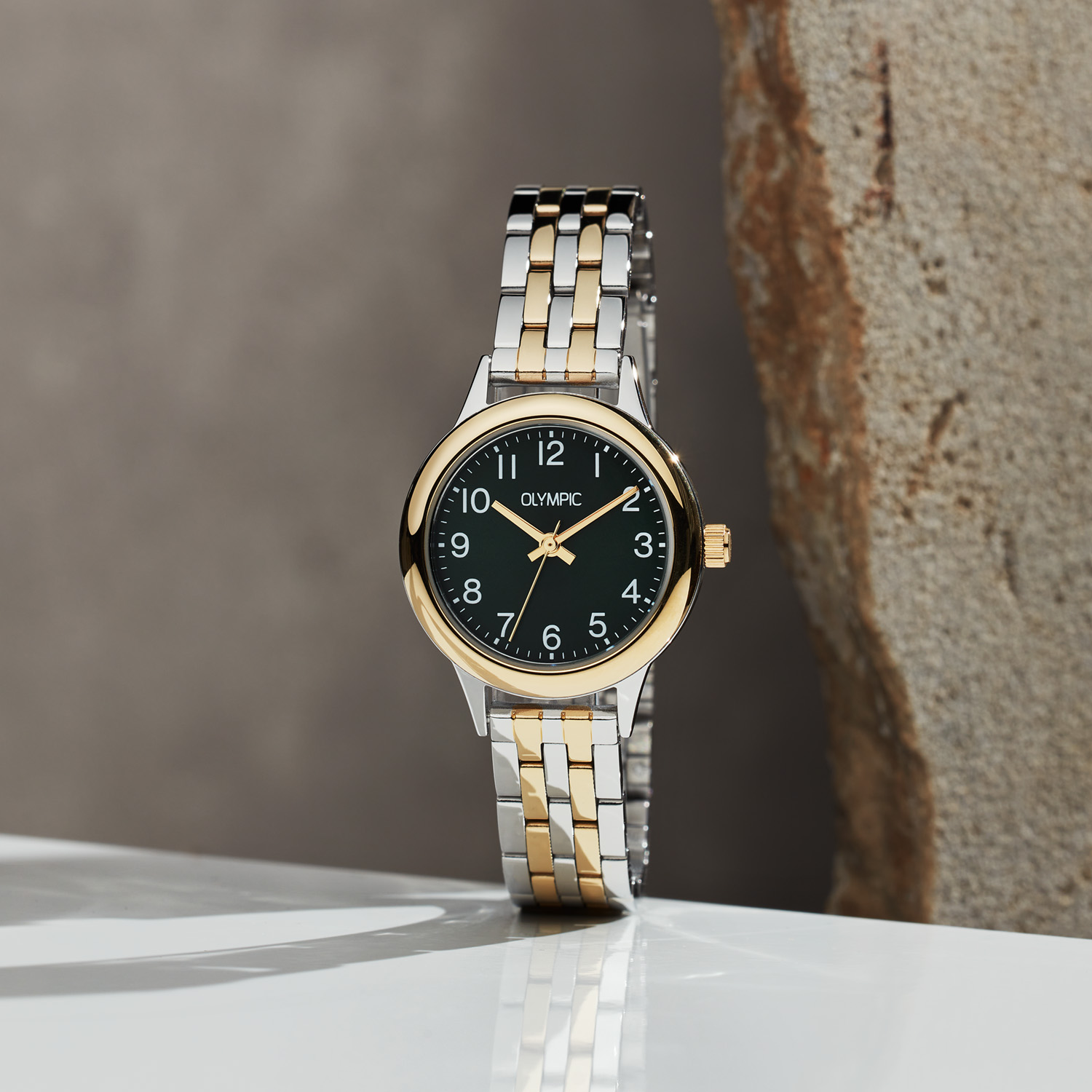 Dit unieke Olympic horloge met artikelnummer: OL80DSS004B is een dameshorloge met een chique uitstraling. Het horloge heeft een ronde stalen kast met een goudkleurige bezel, een groene sunray wijzerplaat met cijfers. Aan de kast zit een stalen fijne bicolor schakelband met vouwsluiting. Het horloge heeft een mineraalglas, een doorsnee van 28mm en is 5ATM.