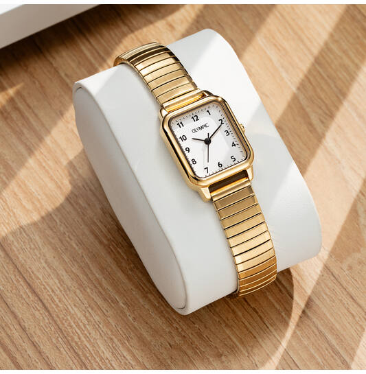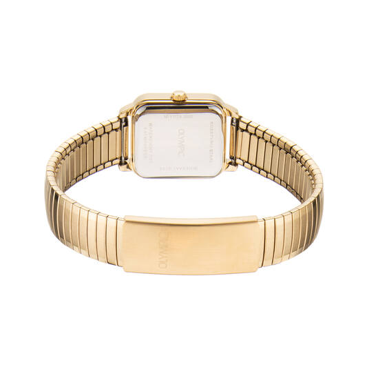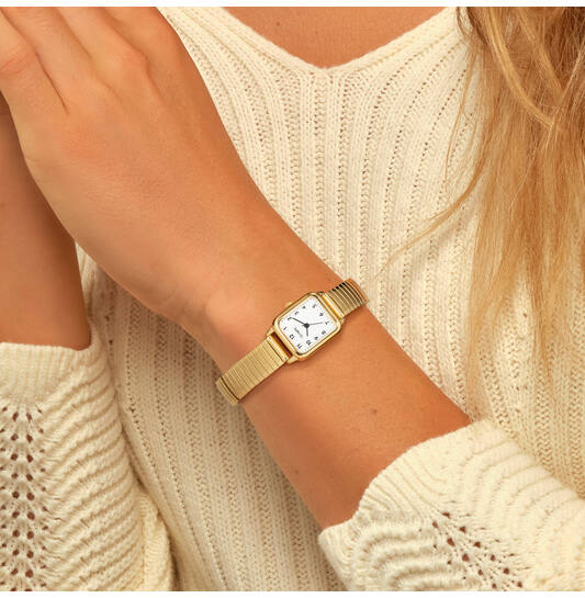 Het goudkleurige horloge heeft een rechthoekig kastje met een witte wijzerplaat met zwarte arabische cijfers en wijzers. Aan het horloge zit een goudkleurige rekband. Het horloge heeft een mineraalglas, een afmeting van 20.4 bij 23.4 mm en is 5 ATM waterdicht