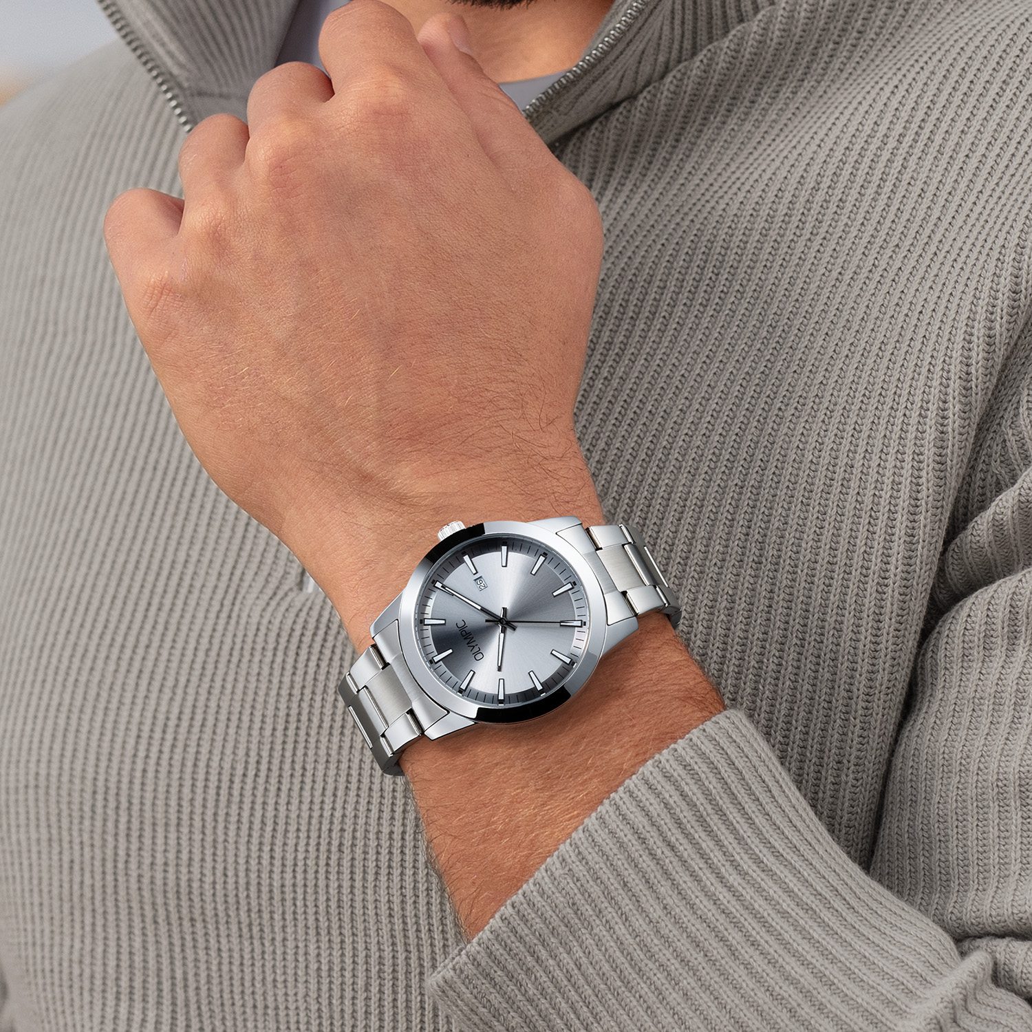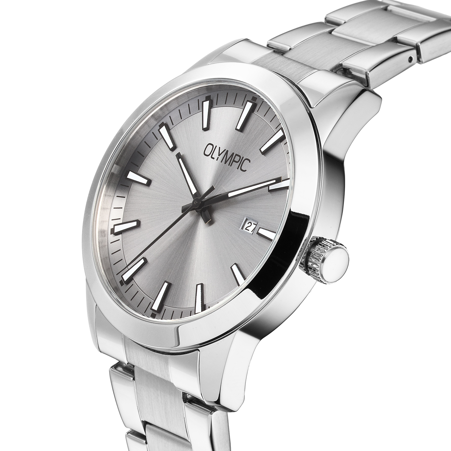 Dit unieke Olympic horloge met artikelnummer: OL90HSS001 is een heren horloge met een classic sportieve uitstraling. Het horloge heeft een ronde stalen kast met een grijze wijzerplaat met strepen als uursaanduiding en een datum. Aan de kast zit een zilverkleurige stalen schakelband met vouwsluiting. Het horloge heeft een mineraalglas, een doorsnee van 42mm en is 5ATM.