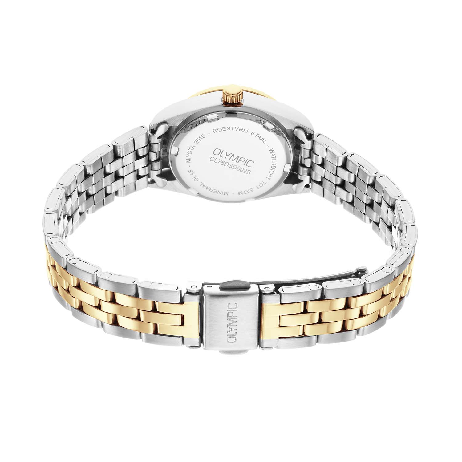 Dit unieke Olympic horloge met artikelnummer: OL75DSD001B is een dameshorloge met een chique sportieve uitstraling. Het horloge heeft een ronde stalen kast met een geribbelde goudkleurige bezel, een zilverkleurige wijzerplaat en een datum en lumibrite in de uursaanduiding. Aan de kast zit een fijne stalen bicolor schakelband met druksluiting. Het horloge heeft een mineraalglas, een schroefdeksel, een doorsnee van 26mm en is 5ATM.