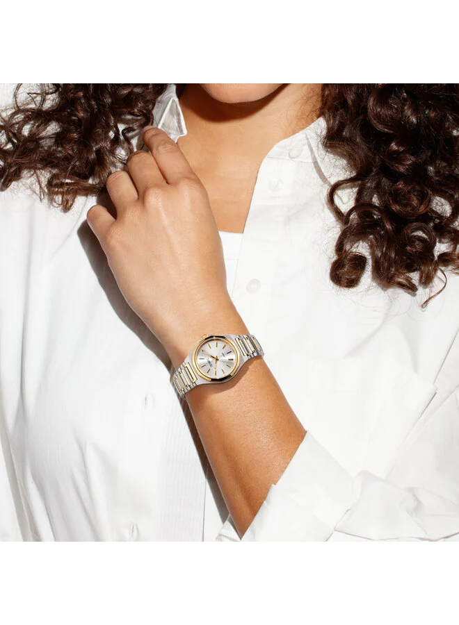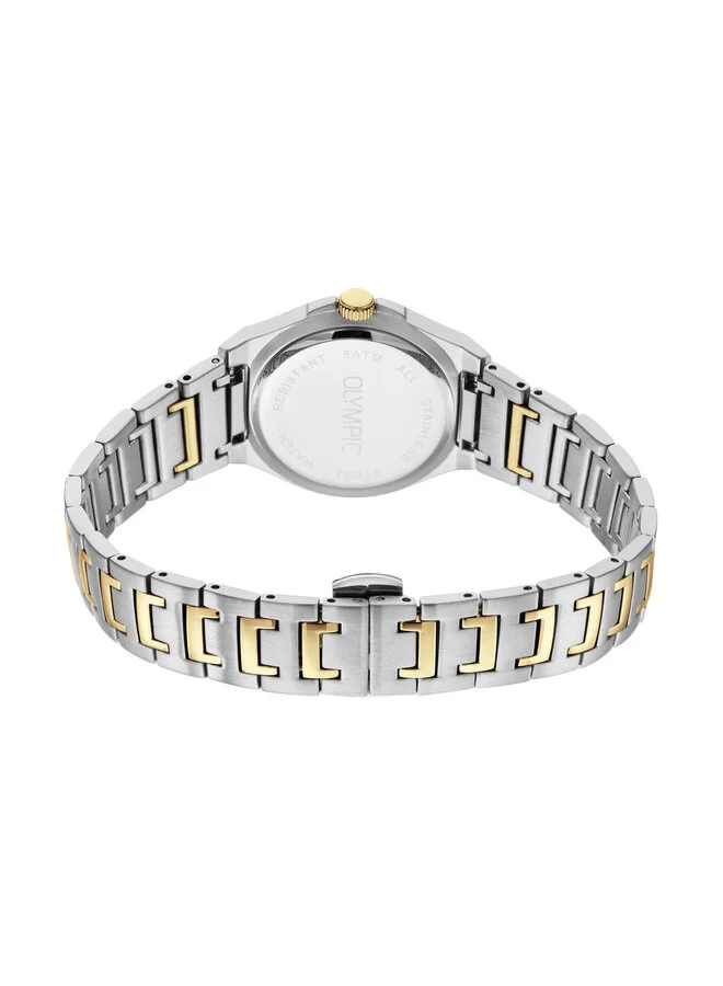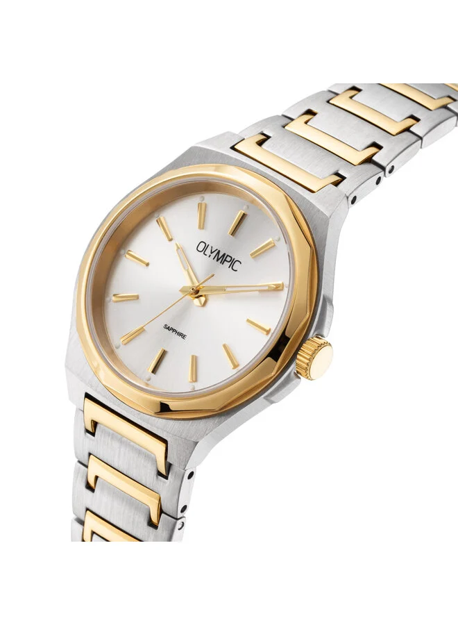 Dit unieke Olympic horloge met artikelnummer: OL66DSS027B is een classic dameshorloge. Het horloge heeft een stalen kast met een glanzende goudkleurige bezel, een zilverkleurige wijzerplaat met streepjes als uursaanduiding en fijne wijzers. Aan de kast zit een stalen bicolor schakelband met een vouwsluiting. Het horloge heeft een saffierglas, een doorsnee van 32mm en is 5ATM.