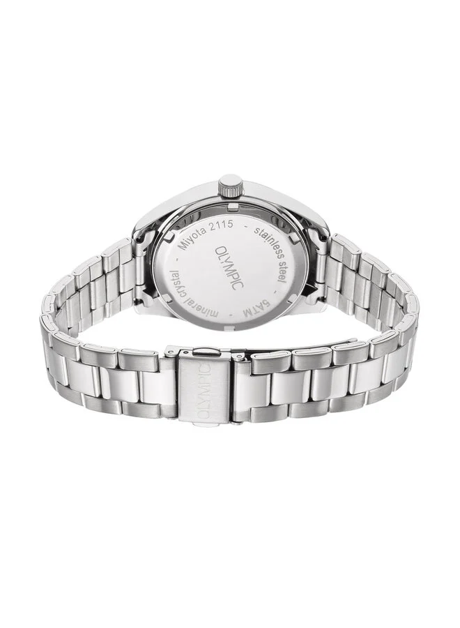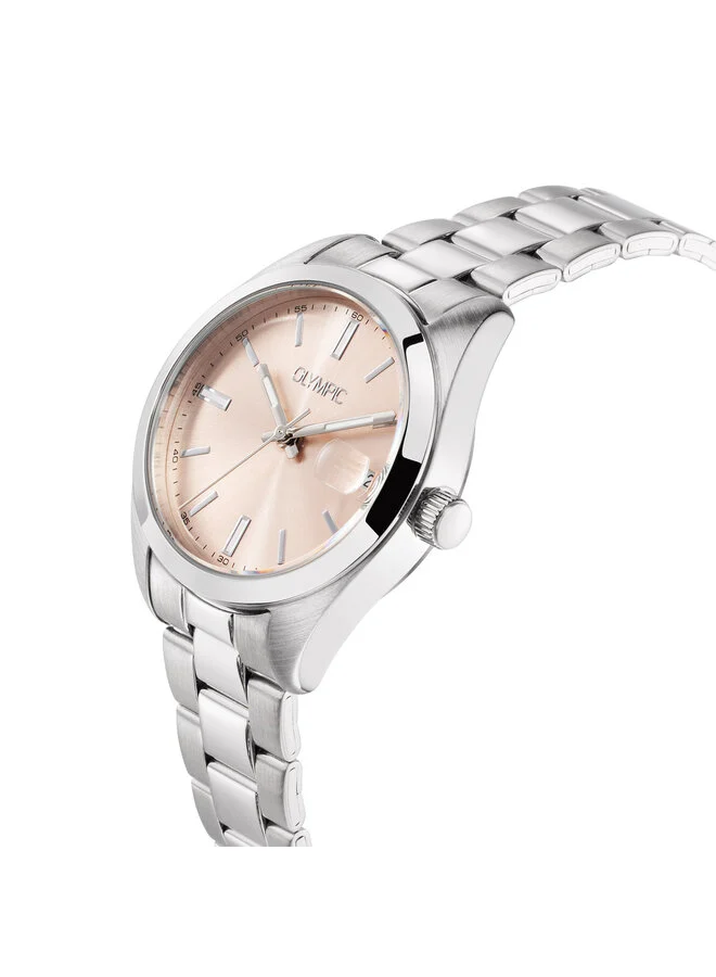 Dit unieke Olympic horloge met artikelnummer: OL75DSS002 is een classic dameshorloge. Het horloge heeft een stalen kast met een glanzende bezel, een zacht roze wijzerplaat met streepjes als uursaanduiding en een datum. Aan de kast zit een stalen schakelband met een vouwsluiting. Het horloge heeft een mineraalglas, een doorsnee van 33mm en is 5ATM.