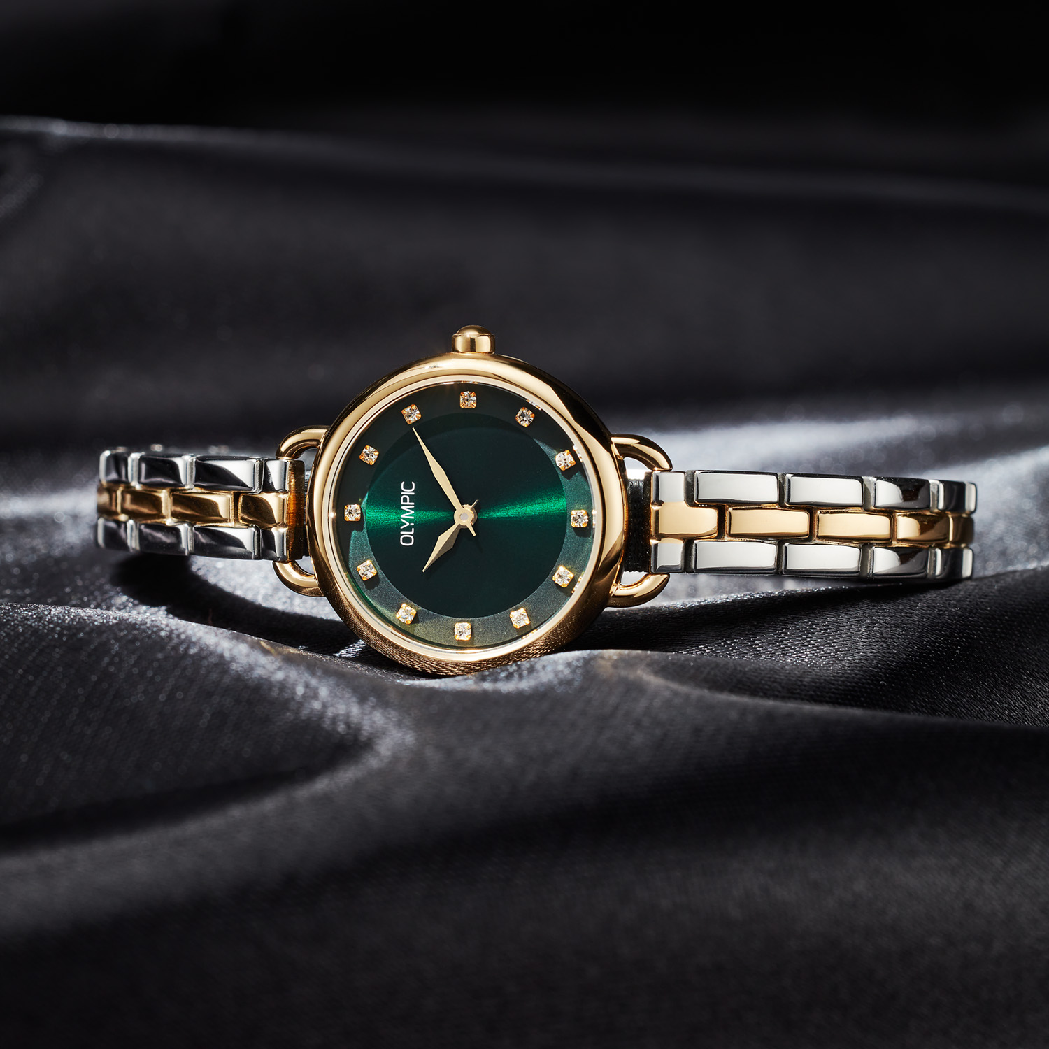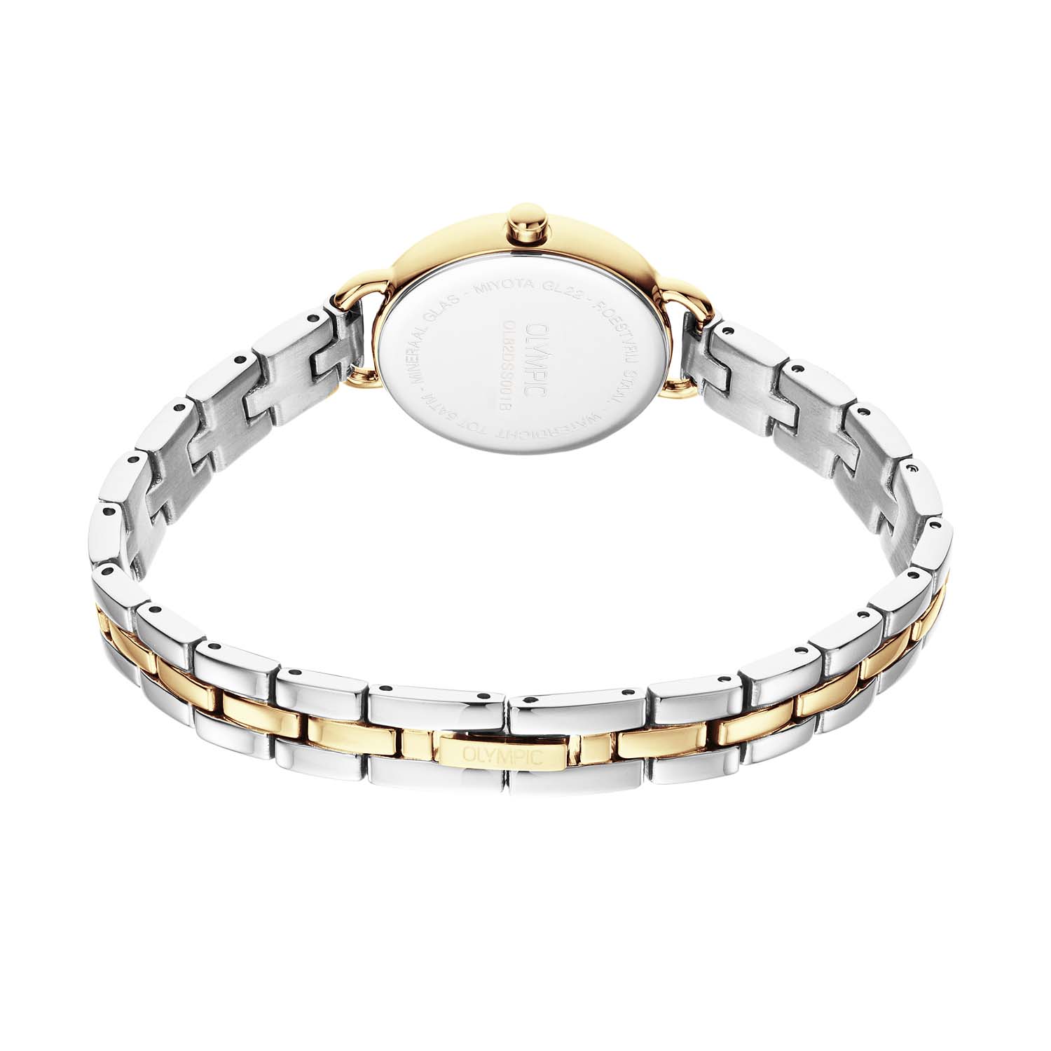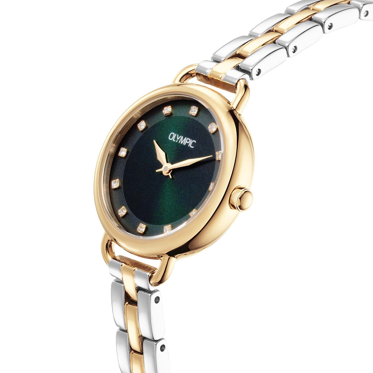Dit unieke Olympic horloge met artikelnummer: OL82DSS001B is een dameshorloge met een chique uitstraling. Het horloge heeft een ronde stalen kast met een goudkleurige bezel, een groene sunray wijzerplaat met zirkonia als uursaanduiding en sierlijke wijzers. Aan de kast zit een stalen fijne bicolor schakelband met druksluiting. Het horloge heeft een mineraalglas, een doorsnee van 26mm en is 5ATM.