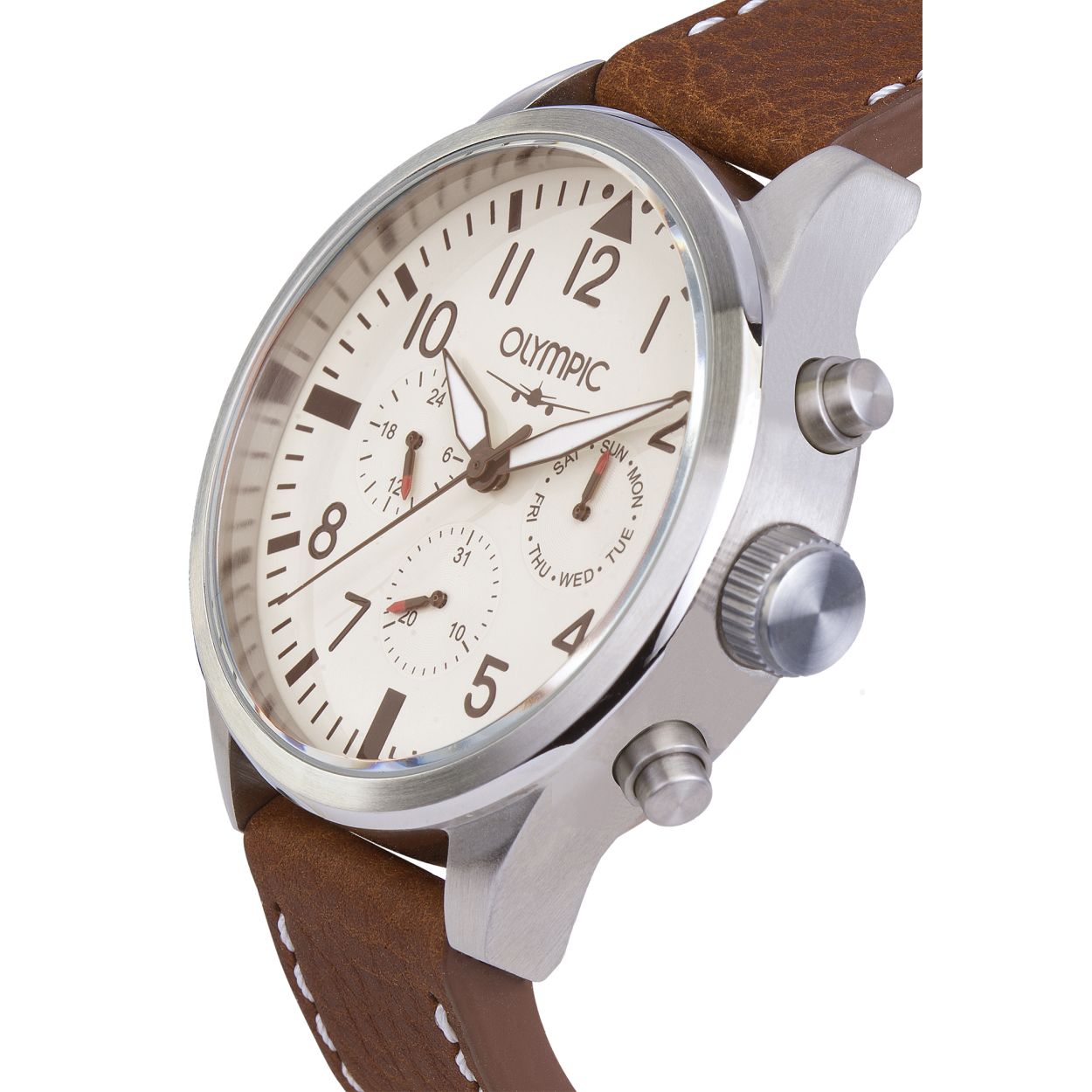 Bestel nu de Olympic OL89HSL042 in onze veilige webshop. Dit Olympic herenhorloge heeft een band van bruin leder en een kast van edelstaal. De Olympic Multifunction OL89HSL042 heeft met 46 mm. een mooi formaat en wordt afgemaakt met een beige gekleurde wijzerplaat. Het materiaal glas van dit uurwerk is mineraal glas, en het horloge is 5 ATM (douchen) waterdicht.
