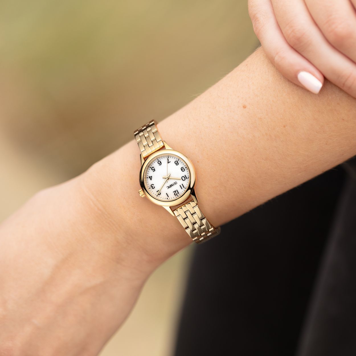 Dit unieke Olympic horloge met artikelnummer: OL80DDD001 is een dameshorloge met een chique uitstraling. Het horloge heeft een ronde goudkleurige stalen kast met een parelmoer wijzerplaat met cijfers. Aan de kast zit een stalen fijne goudkleurige schakelband met vouwsluiting. Het horloge heeft een mineraalglas, een doorsnee van 28mm en is 5ATM.
