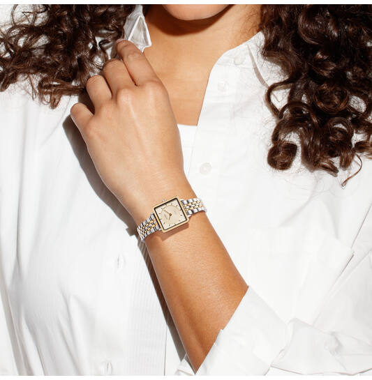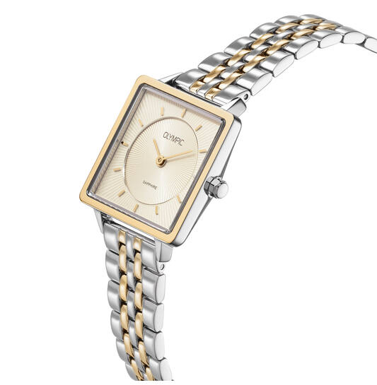 Dit unieke Olympic horloge met artikelnummer: OL1DSS001B is een classic dameshorloge. Het horloge heeft een vierkante stalen kast met een goudkleurige bezel, een cremekleurige bewerkte wijzerplaat met streepjes als uursaanduiding en fijne strakke wijzers. Aan de kast zit een fijne glanzende bicolor stalen schakelband met vouwsluiting. Het horloge heeft een saffierglas, een afmeting van 25x25mm en is 3ATM.