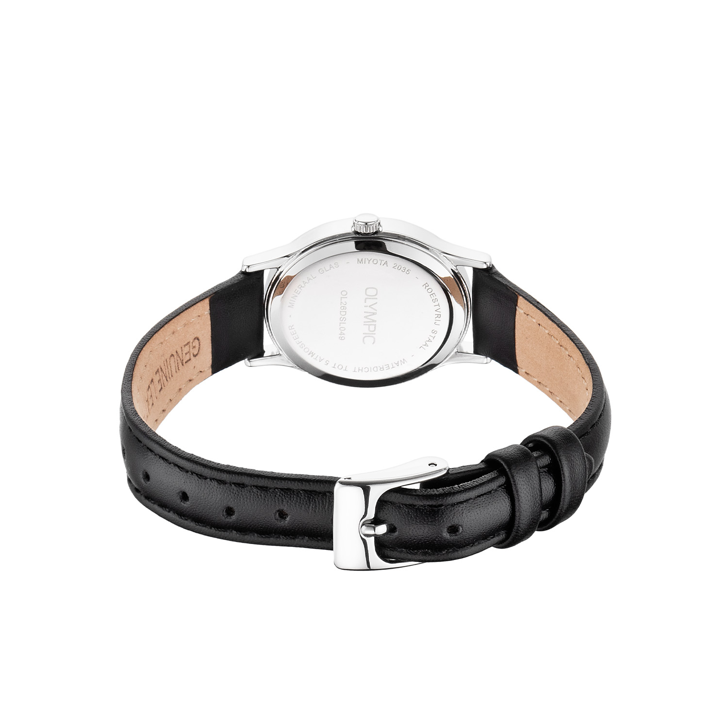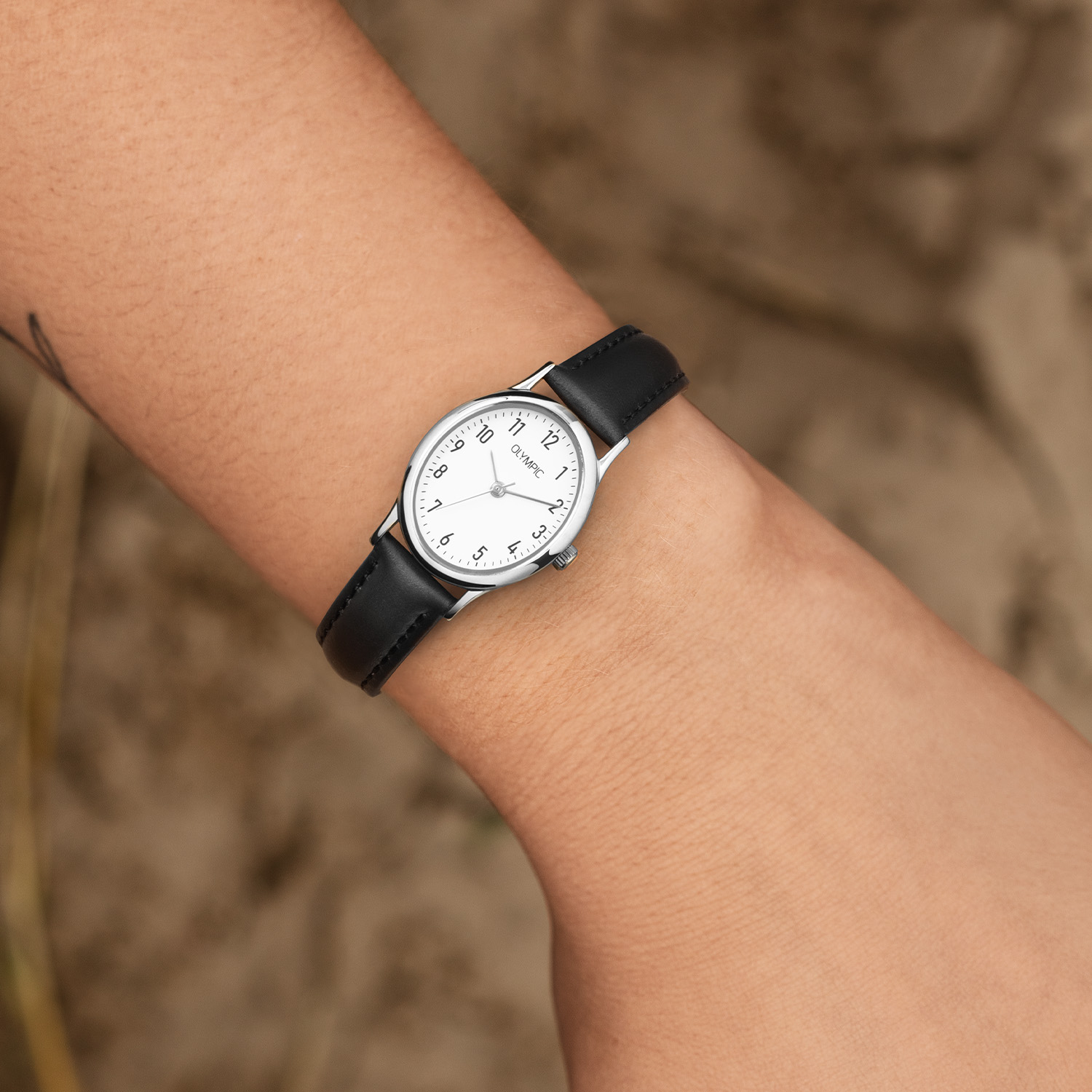Dit unieke Olympic horloge met artikelnummer: OL26DSL049 is een dameshorloge met een classic uitstraling. De stalen ovale kast heeft een gladde bezel en een witte wijzerplaat met Arabische cijfers. Dit geeft het horloge een chique uiterlijk. Aan de stalen kast zit een zwarte lerenband met een gespsluiting. Het horloge heeft een mineraalglas, een doorsnee van 27mm en is 3ATM.