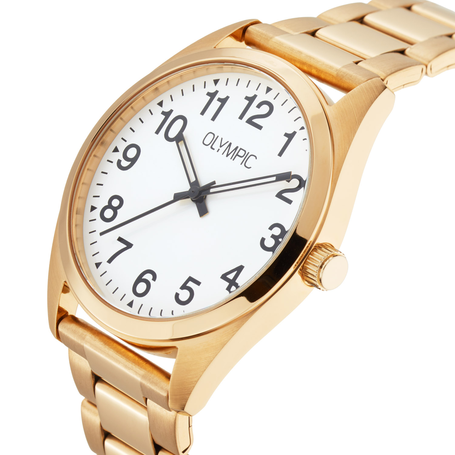 Dit unieke Olympic horloge met artikelnummer: OL89HDD002 is een herenhorloge met een classic sportieve uitstraling. Het horloge heeft een ronde stalen goudkleurige kast met een witte wijzerplaat met Arabische cijfers en opengewerkte wijzers. Aan de kast zit een goudkleurige stalen mat glanzende schakelband met vouwsluiting. Het horloge heeft een mineraalglas, een doorsnee van 38mm en is 5ATM.