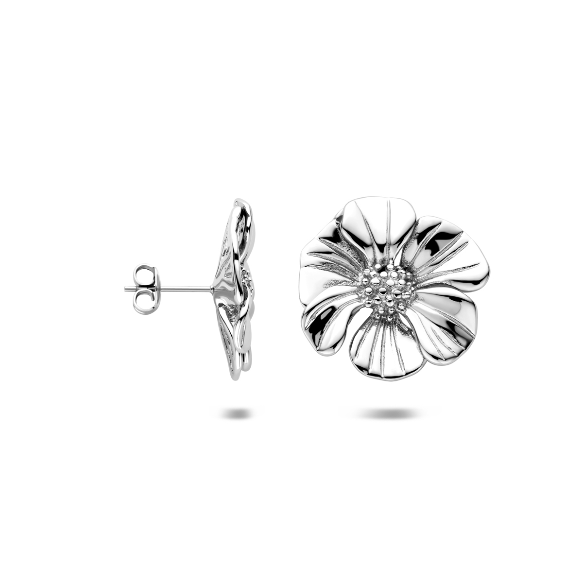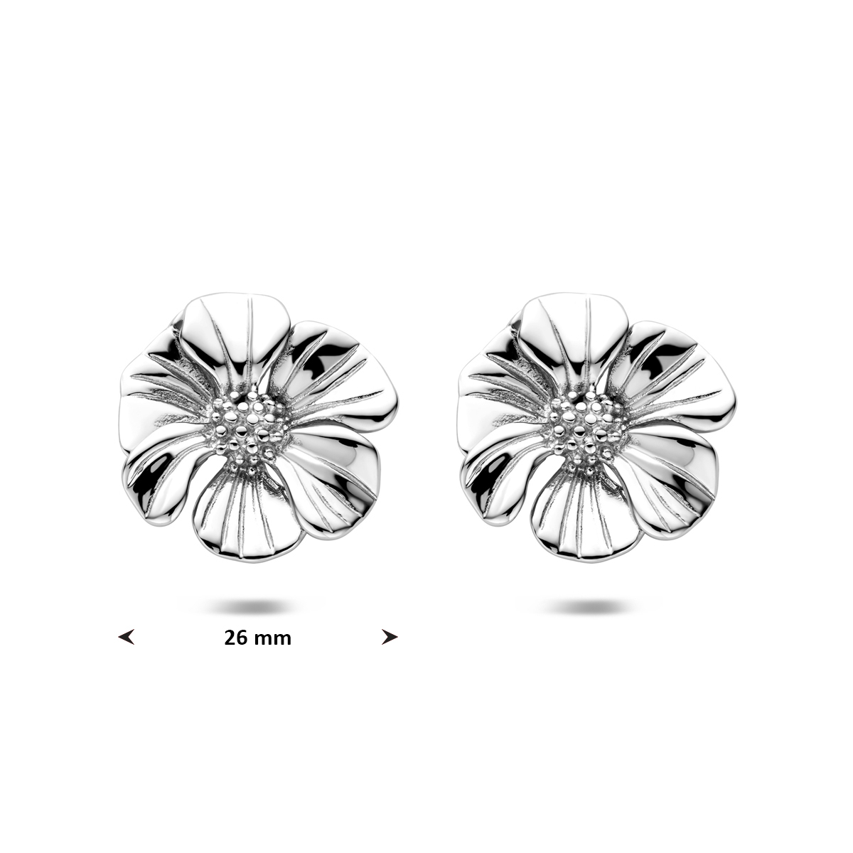 Stalen oorknoppen uitgevoerd in de vorm van een bloem. De oorknoppen hebben een diameter van 26mm.