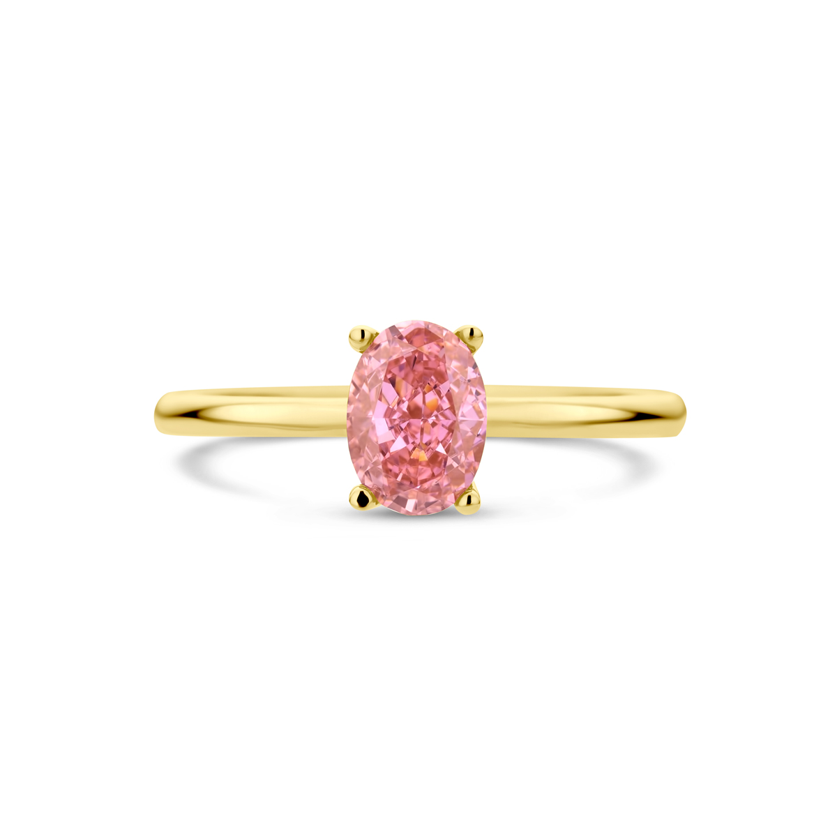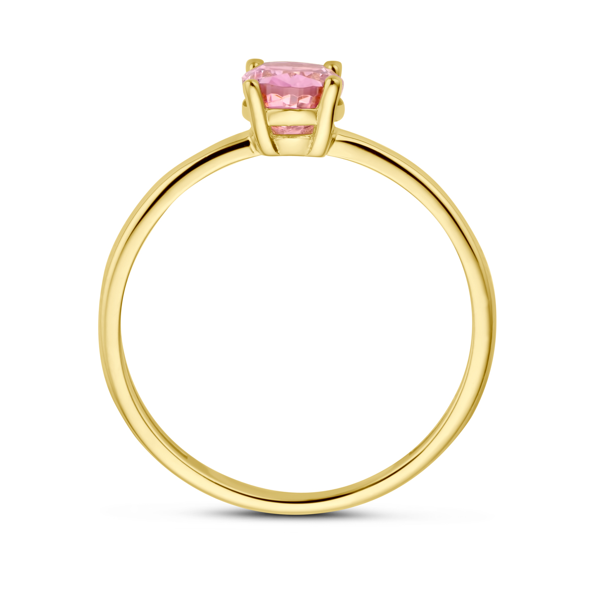 14k Geelgouden ring uitgevoerd met een ovale padparadscha zirkonia. De ring heeft een breedte van 7mm.
