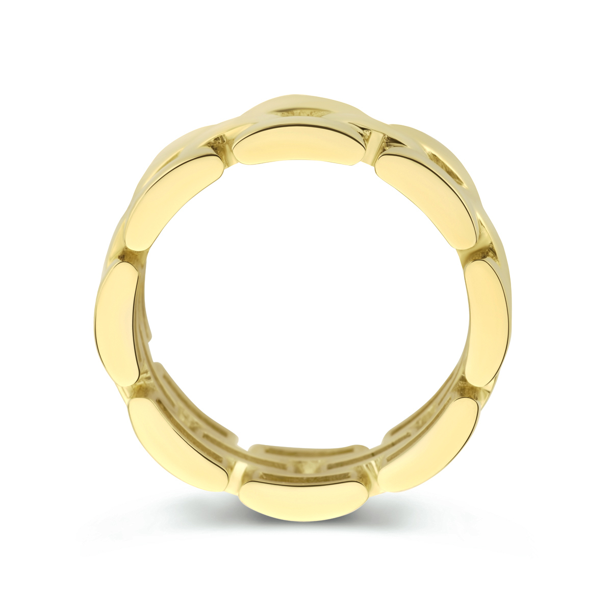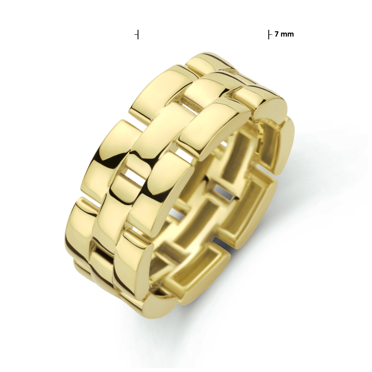14k Geelgouden ring uitgevoerd in schakelvorm. De ring heeft een breedte van 7mm.