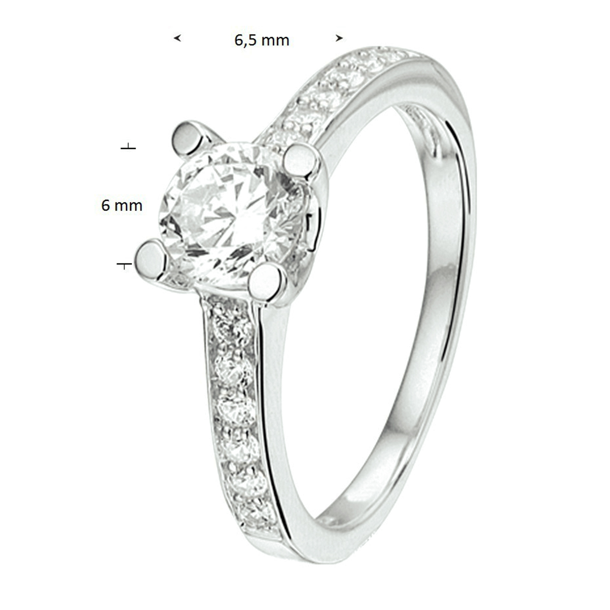 Gerhodineerd zilveren ring van 6.5mm breed en uitgevoerd met een luxe rijzetting van briljant geslepen zirkonia en 6mm zirkonia in een chaton zetting.