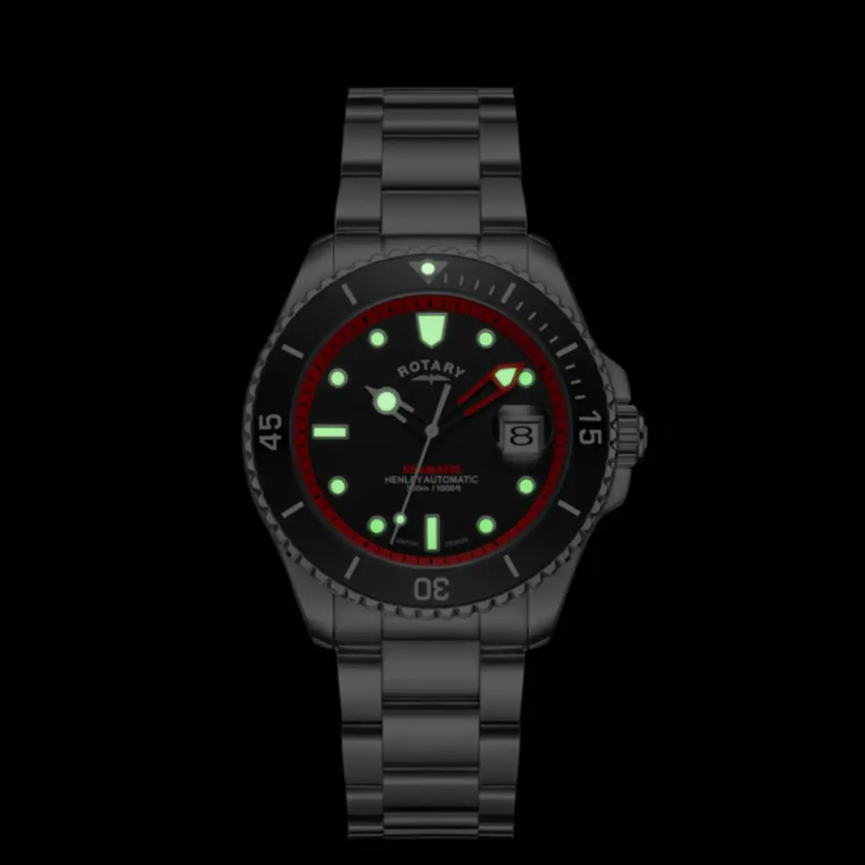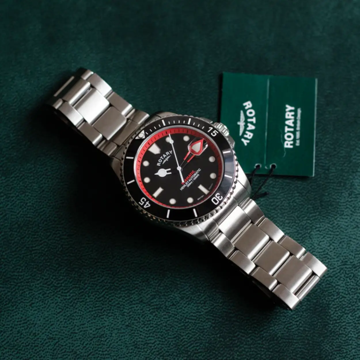 This Rotary Seamatic dive watch is enviably high-spec: it features a stainless steel casing and 3 link bracelet secured by a Divers Z clasp for optimal on-wrist security. The black dial with accented red dial details, which displays luminous indices and open hour/minute hands, is protected beneath sapphire glass with a date window feature.
